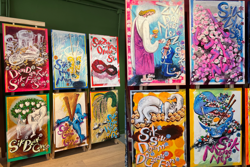 展廳一隅。 歐陽應霽多年來對香港粵語裏有關日常飲食生活情境的俗語都相當感興趣,而在2023年農曆新年期間,他正式啟動個人飲食語言文化檔案計劃“Sik Zi Gei 食自己”,耗時將近兩個月的時間完成36幅作品。