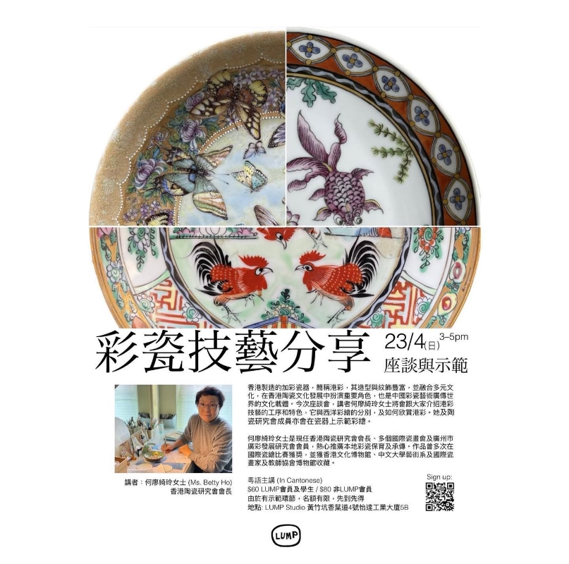 香港新聞網3月30日電 “廣彩”大家聽得多,“港彩”又是一門怎樣的技藝?LUMP Studio邀請香港陶瓷研究會會長何廖綺玲及該會成員,於4月23日在LUMP Studio進行座談會。何廖綺玲將會跟大家介紹港彩技藝的工序和特色,它與西洋彩繪的分別,及如何欣賞港彩。她亦會在瓷器上示範繪畫的技巧。