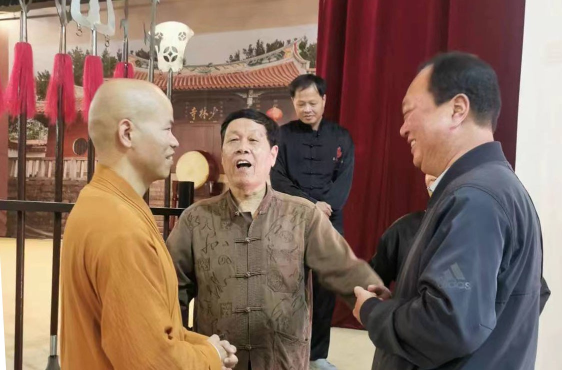龍海五祖拳協會會長莊百堅(右)、漳州市龍文區兩岸對台武術文化交流中心陳金水會長(中)、泉州市武術協會副會長、豐澤武術協會會長、少林寺武僧團理剛團長交流五祖拳文化。