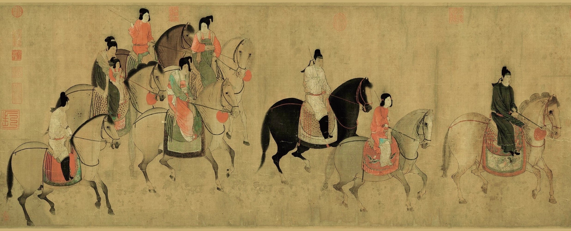 張萱《虢國夫人遊春圖》(局部)。 《虢國夫人遊春圖》是中國藝術史上非常重要的一張作品,描繪了盛唐時期貴族婦女春遊的生活場景。此畫是唐代著名仕女畫家張萱的代表作之一,採用細勁的鐵線描和精緻的設色勾勒出人馬,雖然不著背景,卻頗具韻律,展現出盛唐時期的氣度風貌。此圖原作已佚,現存的是北宋畫院摹本,絹本設色,現藏於遼寧省博物館。 虢國夫人是何許人也?她是唐玄宗寵妃楊玉環的三姐。公元745年,楊玉環被冊封為貴妃。楊玉環的大姐、三姐和八姐,分別被封為韓國夫人、虢國夫人和秦國夫人。不過圖中到底哪位才是虢國夫人的問題,一直以來成為了學者們爭論不休的話題。有人說是最後並行三騎居中的年長婦人,也有人說是打頭陣騎著“三花馬”身著男裝之人才是虢國夫人。這種說法從何而來?“三花馬”也稱“三鬃馬”,是區分馬匹等級和貴族身份的重要標誌。而初盛唐時期婦女胡風和男裝盛行,頭戴烏紗冠、身穿圓領長袍、腳著靴子,最前排的這個人物正好符合了這一點。 展子虔《遊春圖》