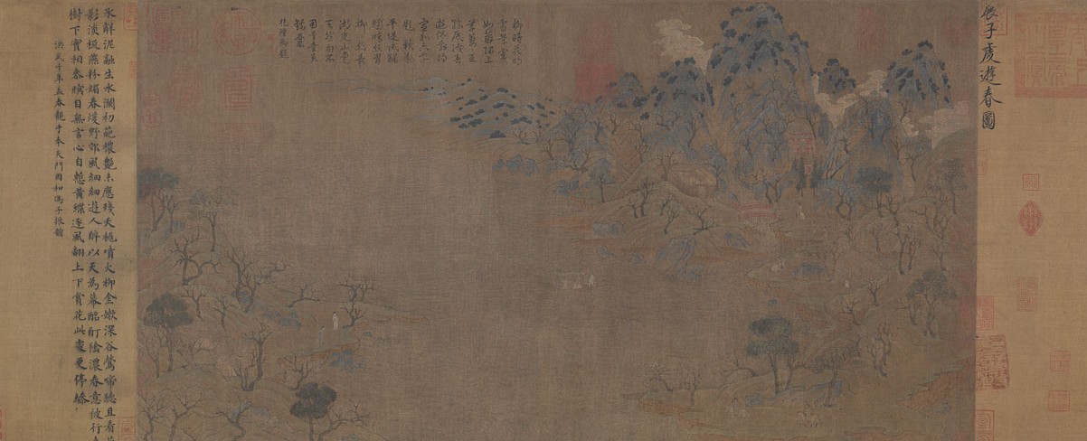 展子虔《遊春圖》(局部)。 《遊春圖》,絹本、青綠設色,現藏於故宮博物院。畫上有宋徽宗題寫的“展子虔遊春圖”六個字。不僅是畫家展子虔唯一傳世的代表作,也是迄今為止世界上最古的畫卷,它的存在,對中國乃至世界的繪畫史、藝術史都具有極為重要的作用。 展子虔,渤海人(現山東陽信縣),曾歷經北齊、北周而入隋。據記載,其善畫山水、台閣、車馬、人物道釋等,所畫山有咫尺千里之趣;人物“神采如生,意度具足”;畫馬也能立有走勢,臥有起躍之勢。展子虔在洛陽、西安、揚州及浙江等地的寺觀中創作了許多壁畫,只可惜我們今天已經見不到這些作品了。 《遊春圖》描繪了人們在風和日麗,春光明媚的季節,到山間水旁“踏青”遊玩的情景。全畫以自然景色為主,人物點綴其間。湖邊一條曲折的小徑,蜿蜒伸入幽靜的山谷。人們或騎馬,或步行,沿途觀賞著青山綠水、花團錦簇的勝境。在波光粼粼的湖面上,一艘遊艇緩緩蕩漾,船上坐著的幾個女子似被四周景色所陶醉,流連忘返。山腰和山坳間建有幾處佛寺,十分幽靜,令人神往。 趙喦《八達春遊圖》 現藏於台北故宮博物院的趙喦《八達春遊圖》,是一幅描繪古人在春日騎駿馬出遊的畫作。此作畫工細膩,為風格華麗的巨幅宮廷畫。畫面描繪八人縱馬遊春,他們以中間一人為主體,相互招呼着、顧盼着。周圍環境似一園林,後有巨型太湖石和豪華欄杆環抱。園林中草木呈新綠之色,馬匹踏著輕步,畫面人物神情輕鬆自如,與踏青遊玩的畫題相符。