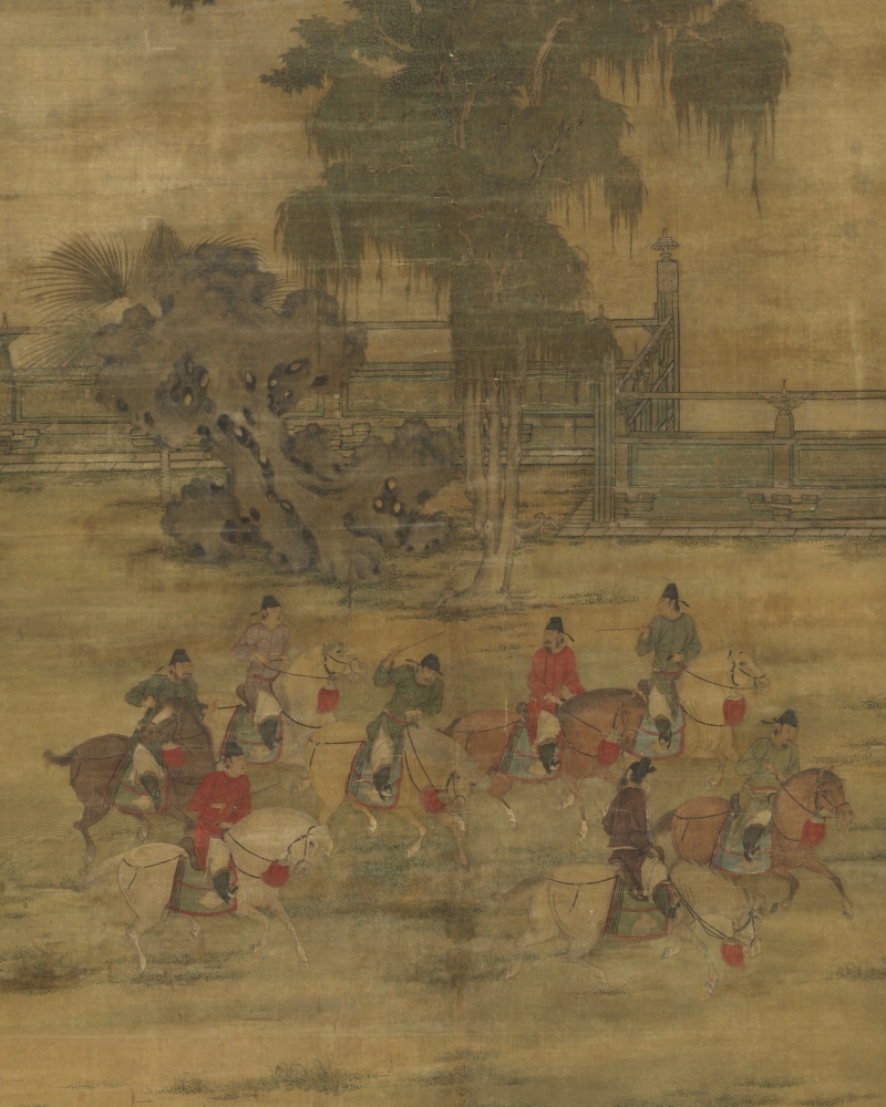 趙喦《八達春遊圖》(局部)。 趙喦,陳州(今河南淮陽)人,活躍於10世紀上半葉,為五代後梁開國皇帝朱溫之駙馬。趙喦集畫家、收藏家、鑒賞家多重身份於一身,曾於唐末亂世之時,不惜花費重金收購名畫五千餘幅,有“趙家畫選場”之稱。他擅繪人物鞍馬,但流傳後世的畫作並不多,其筆下的人物和馬匹皆氣宇不凡。 梁太祖朱溫有8個兒子,關於畫名《八達春遊圖》中的“八達”一詞,有學者推敲很可能代表的是朱溫的八位皇子。而這幅畫便是身為駙馬的趙喦描繪這八位皇子的宮苑活動之作。皇子們身穿紅、紫、綠三色衣物,可見梁代依循唐制的穿衣風格。八人的面容不但角度各異,且每個人的五官、臉型、鬚髮等細節都照顧得頗為仔細,足見畫家的技巧與用心。 戴進《春遊晚歸圖》