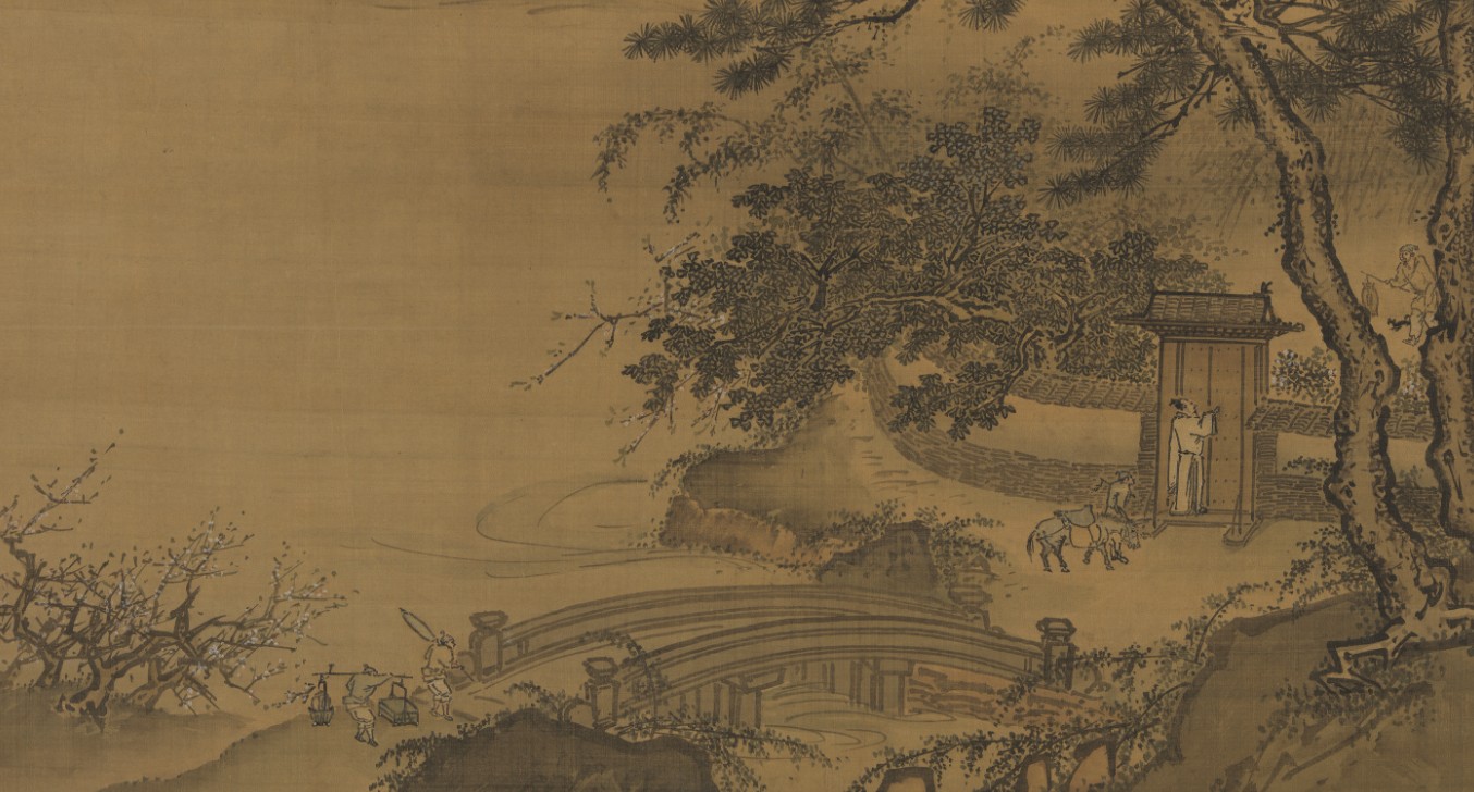 戴進《春遊晚歸圖》(局部)。 《春遊晚歸圖》現藏於台北故宮博物院。戴進,字文進,號靜庵,又號玉泉山人,浙江錢塘(今杭州)人。據說他早年隨著當地畫家學畫,以擅畫山水、人物而知名。宣德年間,推薦入宮廷供職,由於畫藝超群,享譽王公貴卿之間。不過,後來受到同僚的嫉妒與排擠,不得重用,悵然南歸。放歸後,在杭州仍然繼續作畫,從學者甚眾,對當時畫壇影響甚巨,後世稱其為浙派之祖。 《春遊晚歸圖》右下角的前景,畫一座庭院,伸出牆外的樹枝、路邊紅色的桃花,都透露出“春天”的氣息。一名士人正在敲門,庭院中有個僕人提著燈籠前來應門,顯示著春遊主人“晚歸”的詩意。中景的田野小徑上,兩個農人扛著鋤頭回家,遠處農舍的空地上,有個農婦正在餵食家禽,人物雖小,顯示出畫家對細節的用心描寫。 這幅畫的筆墨多取法自南宋時代的馬遠、夏圭一派,構圖上雖仍舊沿襲著南宋院畫體系風格,保留了大部分空虛的地方,但是畫面比較平板,近景和遠山幾乎是在同一平面上,較缺乏景致空間的深度。畫上並沒有作者的落款和印章,但是從畫風,再比照其它畫作來看,似可推斷是戴進在北京時期的作品。繪畫技法功力深厚,筆墨靈活而變化多端,可稱代表戴進風格的典型作品之一。 【編輯:黃璇】