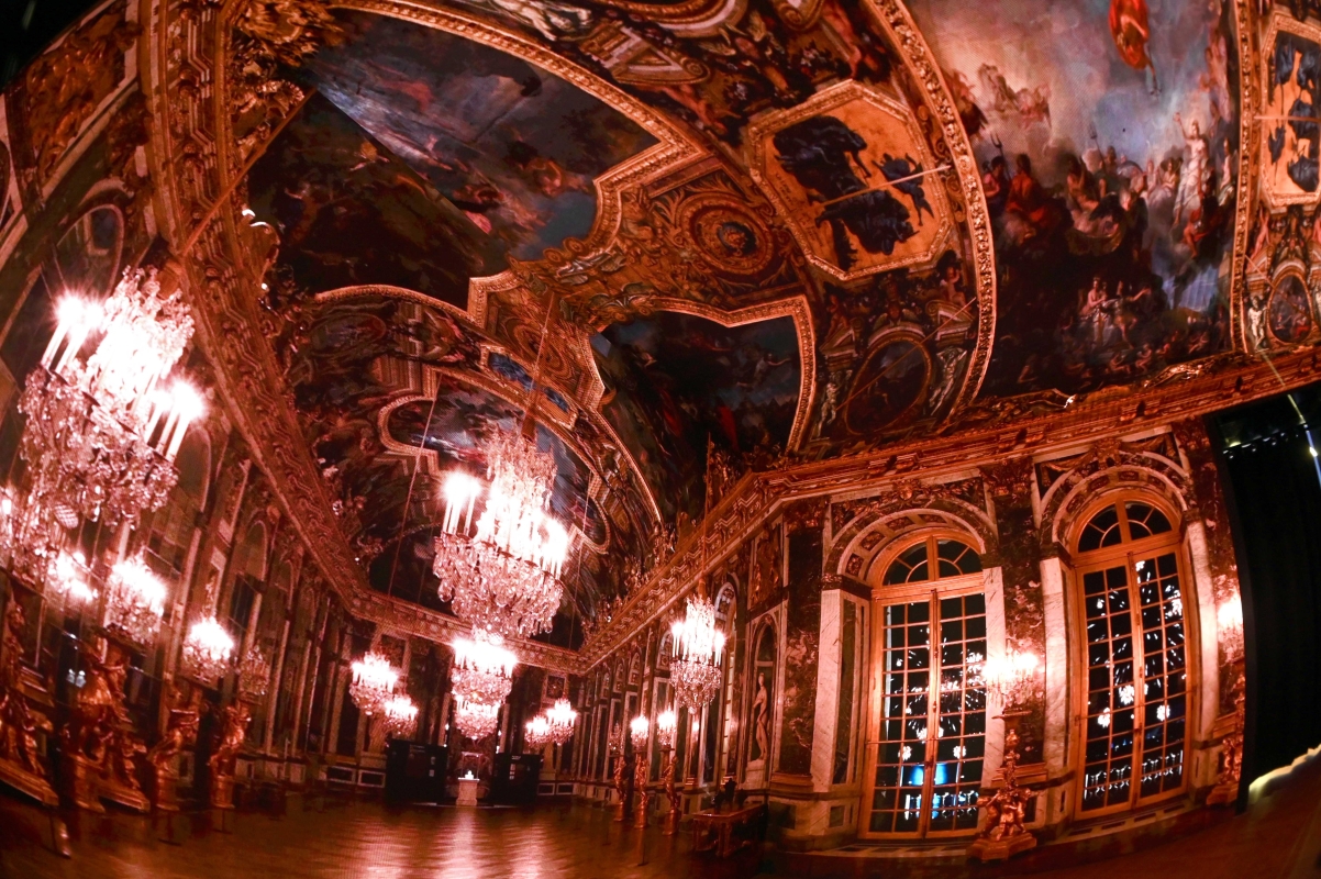 圖為裝設360度電子屏幕的展廳,呈現虛擬凡爾賽宮鏡廳、戰爭廳、墨丘利廳、維納斯廳及王家歌劇院的華麗壯觀景象。 展覽分為六個主題,包括:時空穿梭;凡爾賽宮之輝煌璀璨;凡爾賽宮之百年藝韻;凡爾賽宮之自然景觀;凡爾賽宮之創新及凡爾賽宮一日遊。透過超高清的360度全景映像,向觀眾展示凡爾賽宮最著名的廳堂,例如鏡廳、王家歌劇院和維納斯廳等。特設的多感官體驗裝置讓參觀人士可聽到由科技重構的路易十四的歡迎話語、嗅到法國著名調香大師為凡爾賽宮調製的獨特香氣,以及踏着自行車互動裝置瀏覽王家庭園的自然美景。