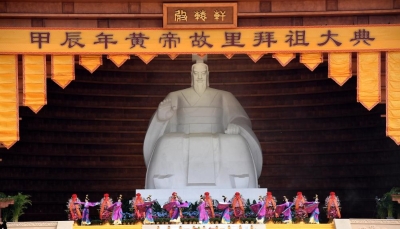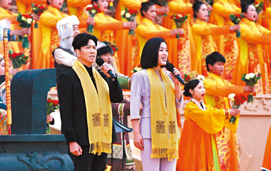 香港新聞網4月24日電 癸卯年黃帝故里拜祖大典前日在河南省新鄭市黃帝故里舉行,來自香港的溫兆倫、台灣的孟庭葦、澳門的彭永琛和內地的白雪,與56個民族的演員以及少年兒童合唱團、百名混聲合唱團,共同領唱《黃帝頌》。