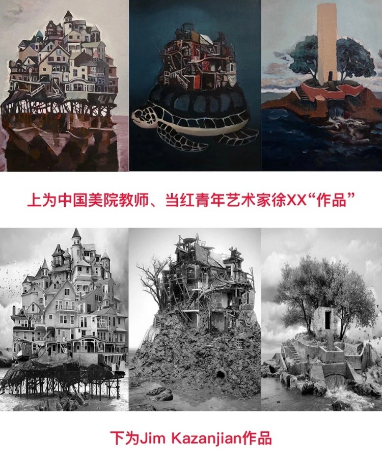 中國美術學院教授徐跋騁被指長期抄襲外國藝術家作品。(圖片來源:小紅書@髒藝術DirtyArt) 綜合《星島日報》與《環球時報》報道,小紅書帳號“髒藝術DirtyArt”於本月19日發文指中國美術學院教授徐跋騁涉嫌長期抄襲外國藝術家作品。 該帳號稱,在深圳OCT當代藝術中心(簡稱OCAT深圳)的“在林中路上:OCAT十八周年典藏展”中看到,參展畫家、中國美術學院教授徐跋騁的作品與美國藝術家卡贊堅(Jim Kazanjian)的作品“堪稱原封不動”相似,經過翻查徐跋騁過往作品,發現大量“復刻”。 該帳號分析稱,徐跋騁的抄襲史可能超過10年,近期作品仍然直接、大量描摹英國藝術家蓋文(Seana Gavin)等人。