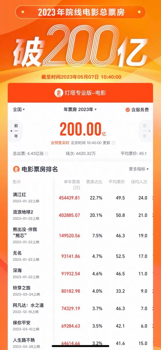 香港新聞網5月8日電 據燈塔專業版數據,截至5月7日10時40分,2023年度大盤票房(含預售)突破200億元(人民幣,下同)。其中《滿江紅》以45.4億元的成績暫列票房榜冠軍,《流浪地球2》位居第二,《熊出沒·伴我“熊芯”》 位居第三。排名前十名票房均超過5億元。 票房前十名如下: 1.《滿江紅》45.4億 2.《流浪地球2》40.2億 3.《熊出沒·伴我“熊芯”》 14.9億 4.《無名》9.31億 5.《深海》9.19億 6.《鈴芽之旅》8.01億 7.《阿凡達:水之道》7.43億 8.《保你平安》6.92億 9.《人生路不熟》6.46億 10.《長空之王》6.17億