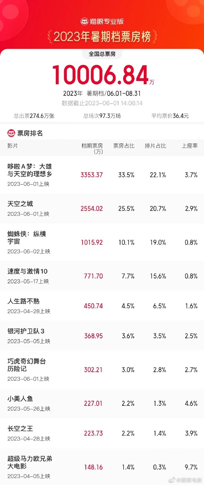 香港新聞網6月1日電  據貓眼專業版數據,6月1日14時,2023年暑期檔總票房(含預售)破億!《哆啦A夢:大雄與天空的理想鄉》《天空之城》《蜘蛛俠:縱橫宇宙》分列暑期檔票房前三位。