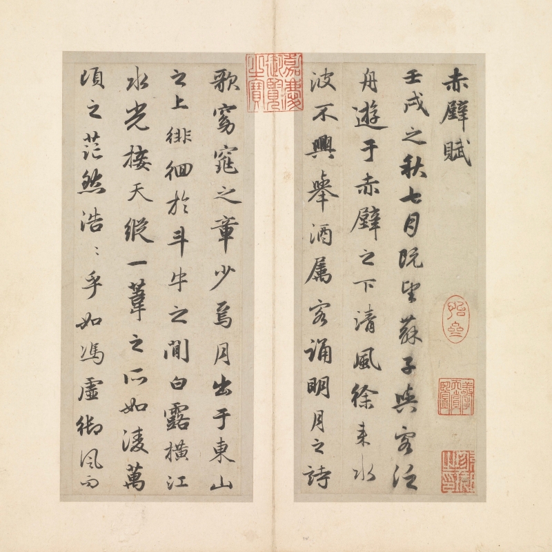 趙孟頫《行書赤壁二賦冊》(局部)。(圖片:台北故宮博物院) 神宗元豐三年(1080年),蘇軾遭貶謫黃州(今湖北黃岡市),期間乘舟遨遊赤壁,並分別在元豐五年的7月、10月寫下兩篇遊記。前篇稱《赤壁賦》或《前赤壁賦》,後篇稱《後赤壁賦》,這兩篇賦文字優美,哲理深刻,對後世的詩文書畫創作有巨大影響。