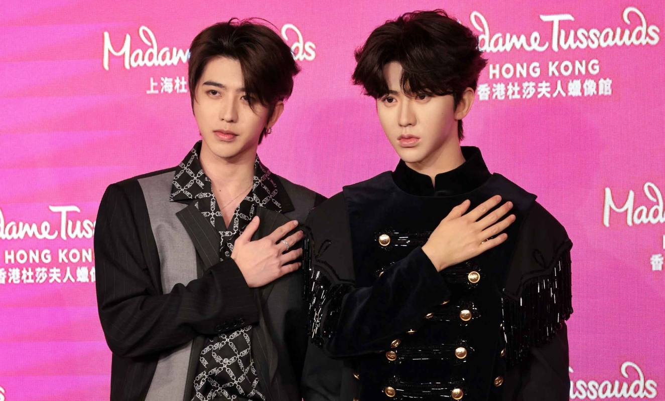 藝人蔡徐坤(左)出席其個人蠟像揭幕禮。