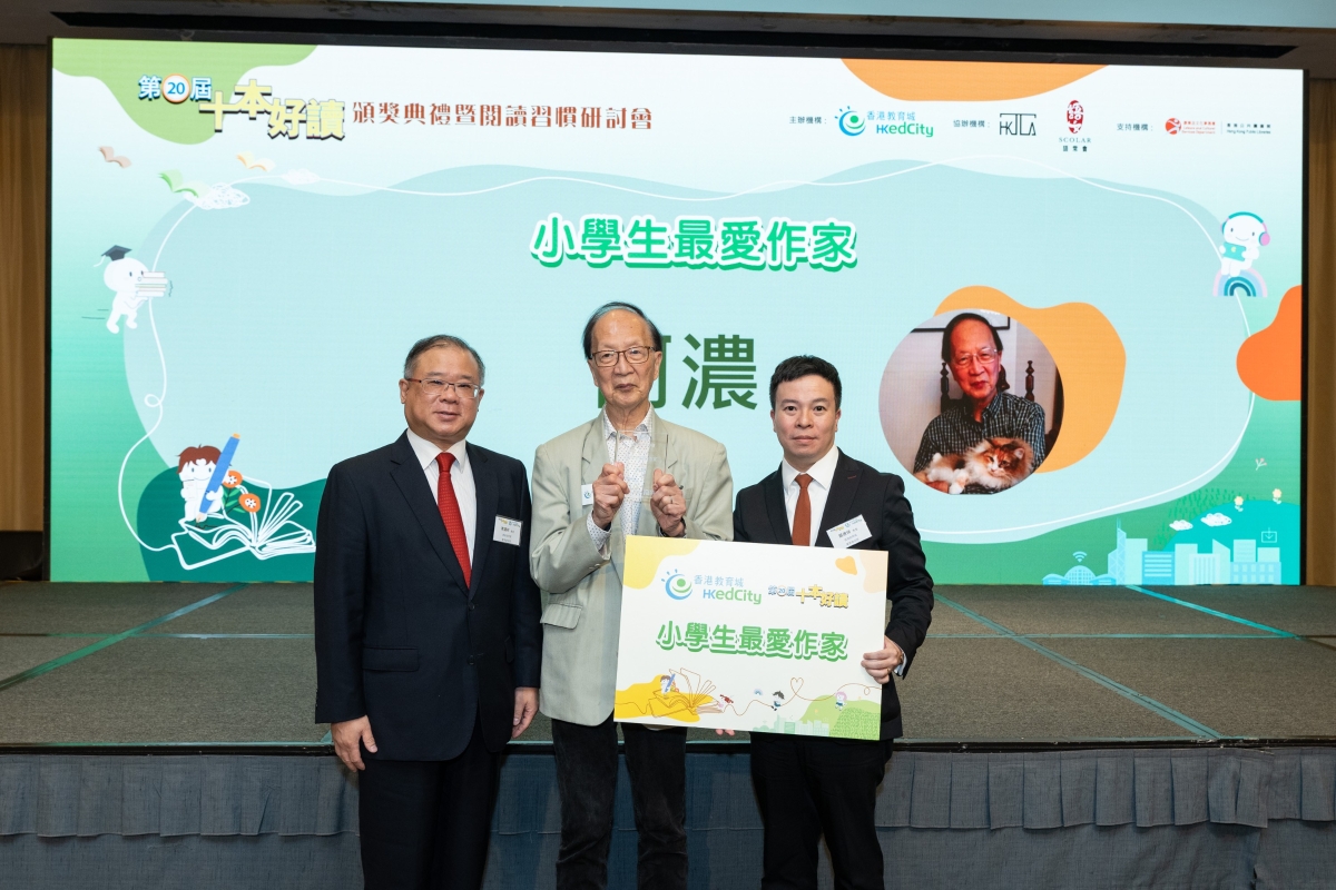 今屆“小學生最愛作家”為阿濃(中)。(主辦方供圖) 今屆“小學生最愛作家”為阿濃,其作品《阿濃身邊的故事》亦奪得教師推薦好讀(小學組)第一名。阿濃筆耕超過半世紀,擅長散文、小說,其平易淺白的寫作風格,令人會心微笑有所頓悟。他多次被中學生推選為最喜愛作家,作品曾獲香港文學雙年獎、冰心文學獎、香港書獎、香港出版雙年獎、中學生好書龍虎榜十本好書等等,深得學生喜愛。 小學組獎項方面,師生同樣愛好繪本。例如以全新視角暢遊經典文學的《西遊記妖界大地圖:神仙妖怪才知道<西遊記>怎麼玩》、傳承社會文化的溫馨小品《沒有手機的童年》、知性與感性兼具的自然繪本《100顆種子》、講述親子關係的《咆哮的媽媽》等等。