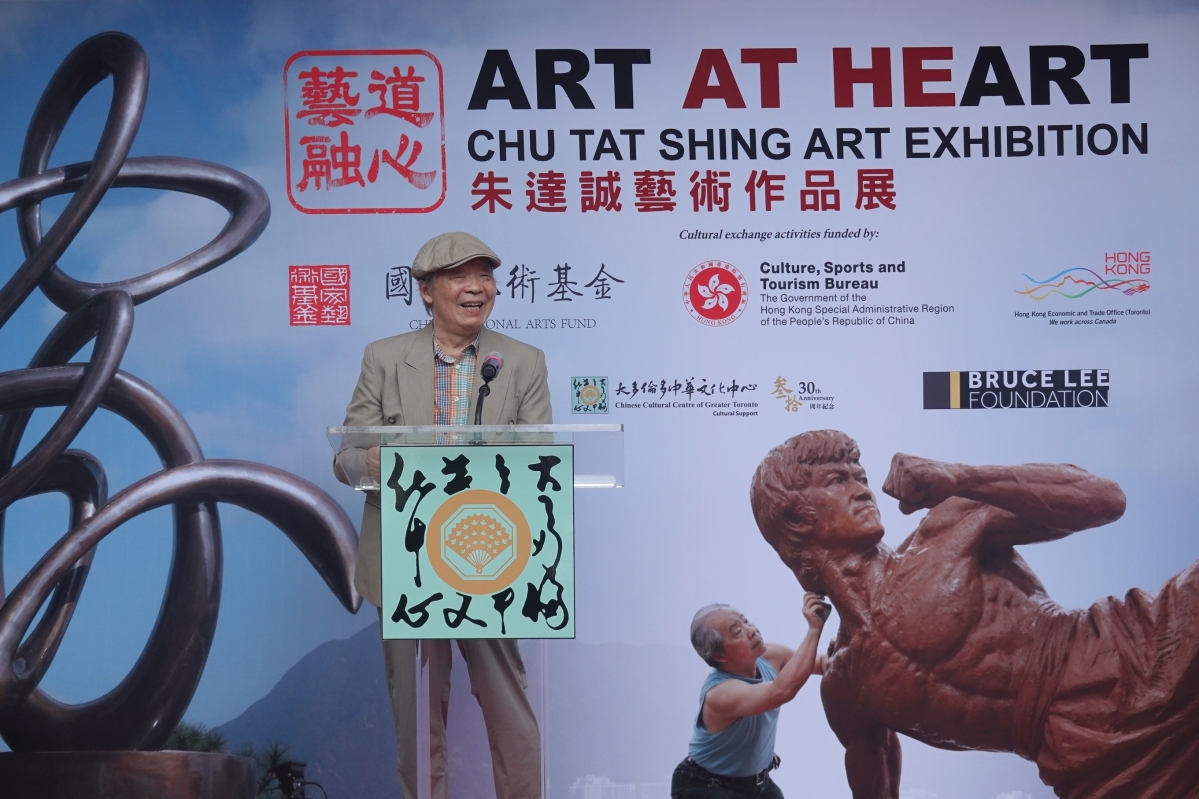 朱達誠在“藝道融心——朱達誠藝術作品展”開幕禮致辭。 展覽由8月4日至13日舉行,展出朱氏逾30件作品,包括青年孫中山在香港接受教育時的人像,以及線條柔美的中國草書書法雕塑,並會舉辦講座、工作坊和現場雕塑示範,讓參加者親身體驗藝術的樂趣,經驗難忘。 多倫多經貿辦處長巫菀菁為展覽開幕禮致歡迎辭時指出,多倫多經貿辦很榮幸能把朱氏的藝術作品帶來加拿大讓當地觀眾欣賞。 巫菀菁說:“李小龍是香港極具代表性的人物。他不但塑造了香港的文化遺產,更突顯香港中外文化交匯的特質。朱達誠老師用心創造新的李小龍雕像,並與多倫多的藝術迷分享,我們能向加拿大介紹如此值得尊敬的香港藝術家,實在深感榮幸。”