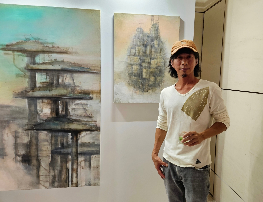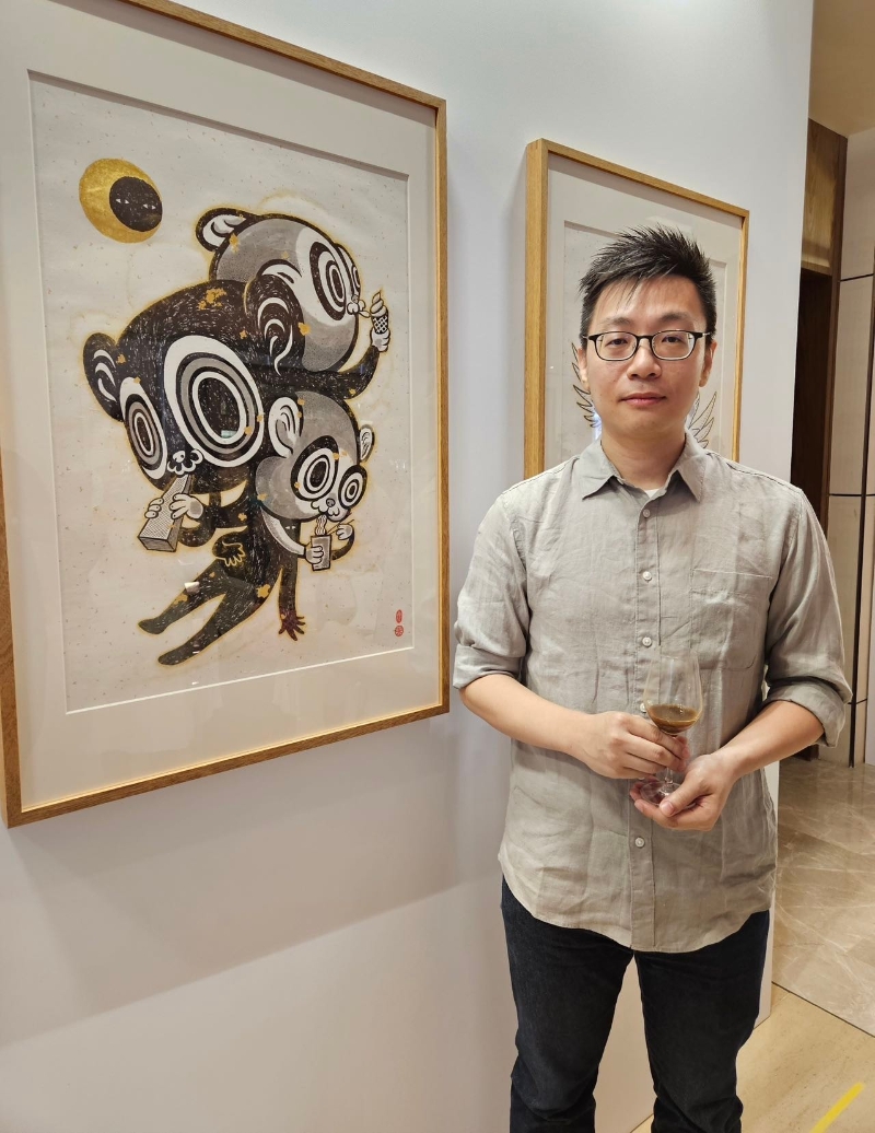 唐偉霖是一位多元發展的藝術家,作品亦為本地及海外藏家私人收藏。(香港中通社記者 黃璇攝) 喜愛自然的唐偉霖相信地球上的一切都賦有自己的生命形式,而正是人類的感知賦予了生物的存在。在這個展覽中,唐偉霖的二維平面作品代表著由人類創造的“人工生物”。 ● “夜行生物”——蔡耀東