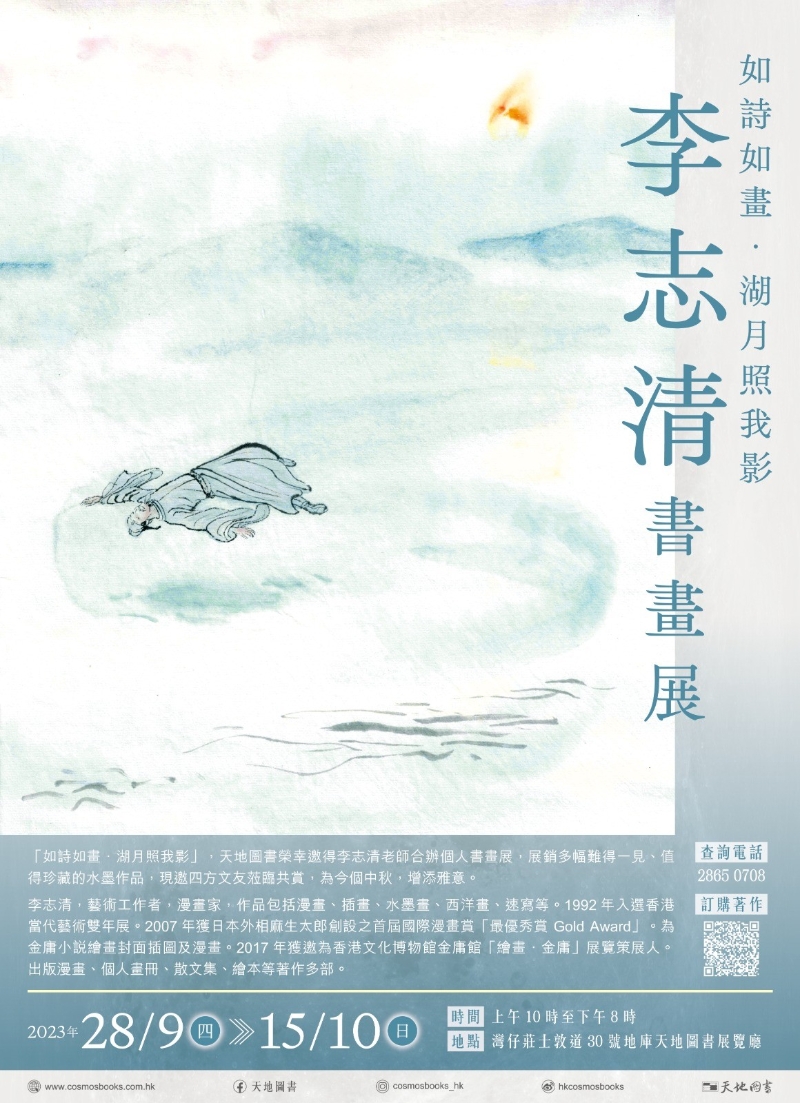 “如詩如畫.湖月照我影:李志清書畫展”海報。 李志清,見證了香港繪畫創作的蛻變。一生致力創作,作品包括漫畫、插畫、水墨畫、西洋畫、速寫等,他再將中西、新舊繪畫技法糅合成李志清獨門的風格。今次在灣仔天地圖書展出的近100幅水墨作品,部份鮮少曝光,部份以唐詩為題,部分是李志清與蒲葦合著的《清蒲集——畫說唐詩一百首》原稿,吸引不少業界及藏家如馬榮成來尋寶。 “如詩如畫.湖月照我影:李志清書畫展” 日期:即日至10月15日 時間:上午10時至晚上8時 地點:天地圖書(灣仔莊士敦道30號地庫展覽廳) 查詢:2865 0708 【編輯:黃璇】