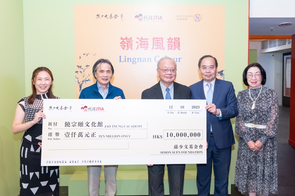 香港新聞網10月13日電 饒宗頤文化館(饒館)獲孫少文基金會(基金會)捐資港幣1000萬元,以支持其藝術館的營運及設施優化。同時,孫少文基金會創會主席、香港大學饒宗頤學術館之友會創會會長、一濤居主人孫少文將借出他所藏饒宗頤與嶺南四君子合繪的作品,供藝術館長期展出。展覽由饒宗頤文化館及一新美術館聯合策劃,並於10月12日開幕。由文化體育及旅遊局局長楊潤雄、一濤居主人孫少文、饒學研究基金永遠行政董事鄧偉雄、饒宗頤文化館管理委員會主席李焯芬、孫少文基金會主席孫燕華,以及一新美術館總監楊春棠共同主禮。