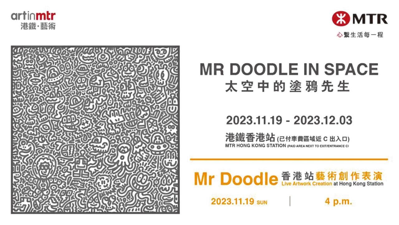 來自英國的塗鴉藝術家Mr Doodle。 今次港鐵希望透過藝術凝聚社區,與藝術門畫廊合作,邀請Mr Doodle“塗鴉先生”首次在香港的公共交通系統上,為一眾乘客及藝術愛好者即席表演塗鴉創作,將車站化身為塗鴉世界。活動當天,一艘2米闊及1.5米高的巨型太空船將降落於香港站,Mr Doodle將運用特製的繪畫工具,在太空船表面即席畫上黑白色的塗鴉圖案,更會在創作中融入港鐵列車圖案,發揮想像力。此外,由本地非牟利團體邀請的十多名兒童,亦會參與創作,與Mr Doodle分享夢想。Mr Doodle的塗鴉插畫亦將遍布港鐵香港站藝術舞台,包括車站牆壁畫布及柱身。