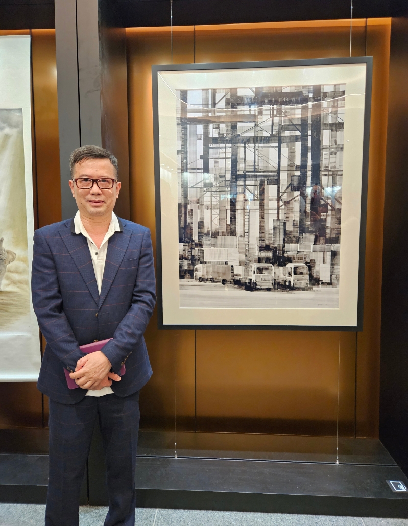 書法家徐沛之為“水墨藝術節”題字。作品以行書書寫並製成立體雕塑品。(香港中通社記者 黃璇攝) “2023年大華銀行年度水墨藝術大獎”展覽展出今次20位得獎者的水墨作品,作品都充滿個人特色,傳遞對當代水墨畫的理解。 李植強憑藉《貨櫃碼頭》獲得本年度“大華銀行年度最佳水墨藝術作品”大獎及“山水風景或具象”公開組金獎,雖為水墨畫,卻並非傳統水墨筆觸,而是結合了透視和空間感,以及些許超現實,呈現城市之間貨櫃碼頭一景。李植強介紹作品時表示,這幅畫呈現如密集建築一般的葵涌貨櫃碼頭,採用了黑與白、濃與淡、實與虛、縱橫交錯、疏密聚散的技巧,展示水墨畫的空間對比。