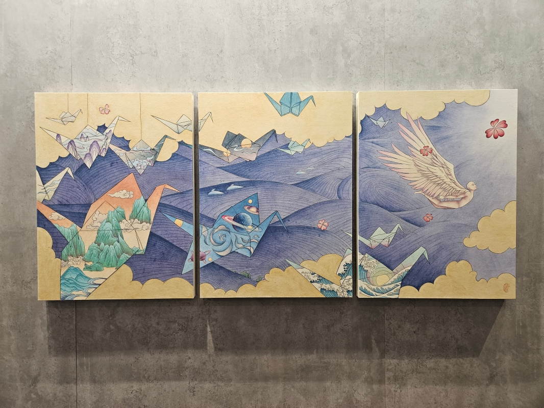 李植強憑藉《貨櫃碼頭》獲得本年度“大華銀行年度最佳水墨藝術作品”大獎及“山水風景或具象”公開組金獎。(香港中通社記者 黃璇攝) 林睿玥則憑《破浪》獲本年度“最具潛質藝術家年獎”及“山水風景或具象”高級學生組金獎。這也是林睿玥繼2019年《魚缸》、2022年《追尋》後,第三次獲得“最具潛質藝術家年獎”。《破浪》色彩濃烈,充滿想像力,畫中主體千紙鶴等元素,寓意揚起信念的風帆,跨越無限的未知,以向上的態度去追求夢想。