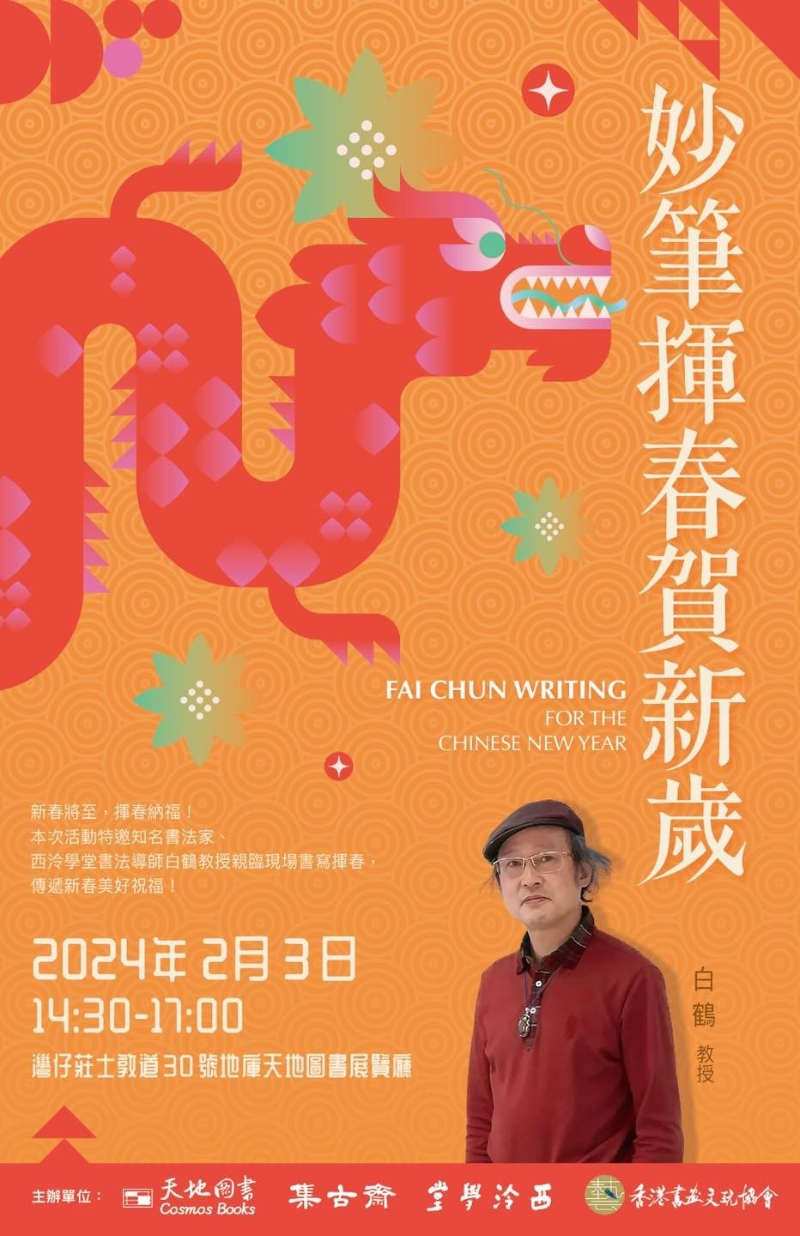 香港新聞網1月31日電 新春將至,揮春納福!值此辭舊迎新之際,集古齋攜手天地圖書、西泠學堂及香港書畫文玩協會,於2月3日(星期六)下午2時30分至5時,在灣仔莊士敦道30號天地圖書展覽廳舉辦“妙筆揮春賀新歲”活動,特別邀請知名書法家、西冷學堂特聘書法導師白鶴親臨活動現場,即席揮毫書寫揮春,讓大家近距離感受書法藝術的獨特魅力,為甲辰新春送上美好祝福。