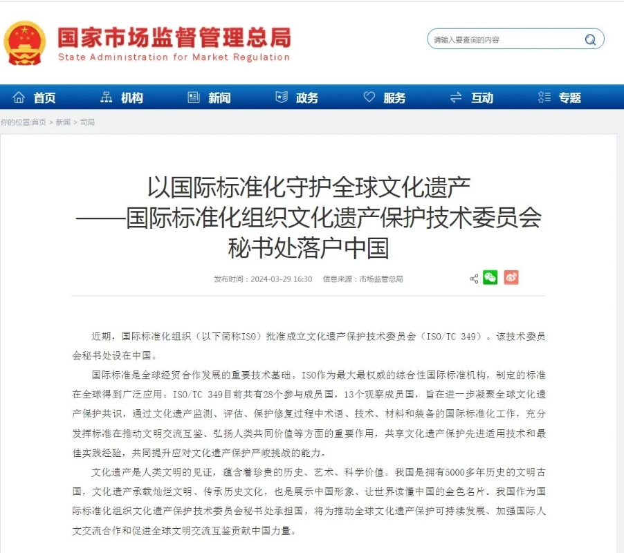(國家市場監管總局網站截圖) 國際標準是全球經貿合作發展的重要技術基礎。ISO作為最大最權威的綜合性國際標準機構,制定的標準在全球得到廣泛應用。ISO/TC349目前共有28個參與成員國,13個觀察成員國,旨在進一步凝聚全球文化遺產保護共識,通過文化遺產監測、評估、保護修復過程中術語、技術、材料和裝備的國際標準化工作,充分發揮標準在推動文明交流互鑒、弘揚人類共同價值等方面的重要作用,共享文化遺產保護先進適用技術和最佳實踐經驗,共同提升應對文化遺產保護嚴峻挑戰的能力。 文化遺產是人類文明的見證,蘊含著珍貴的歷史、藝術、科學價值。中國是擁有5000多年歷史的文明古國,文化遺產承載燦爛文明、傳承歷史文化,也是展示中國形象、讓世界讀懂中國的金色名片。中國作為國際標準化組織文化遺產保護技術委員會秘書處承擔國,將為推動全球文化遺產保護可持續發展、加強國際人文交流合作和促進全球文明交流互鑒貢獻中國力量。 【編輯:黃璇】