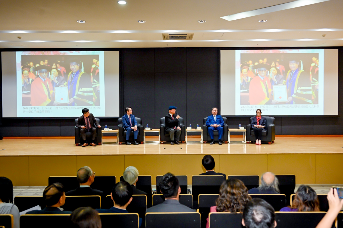 “饒宗頤在澳門故事分享會”主禮嘉賓合照。 分享會主禮嘉賓集合澳港專家、學者,包括全國政協常委崔世昌、全國人大劉藝良、澳門基金會主席吳志良、澳門立法會議員陳浩星、澳門特別行政區教育及青年發展局學生廳代廳長李艷琪、澳門潮屬社團總會創會主席許世元、澳門中華文化交流協會會長李沛霖、澳門大學校長宋永華、香港大學饒宗頤學術館館長李焯芬、香港浸會大學饒宗頤國學院院長陳致、 饒宗頤文化館管理委員會副主席黃景強、饒學研究基金永遠會長饒清芬、饒宗頤學術館之友會長李俊鳴、澳門大學學生事務長彭執中,參與的教育界代表有同善堂中學黃德進校長、東南學校楊燦基校長、陳春新副校長、培華中學李秋林校長、孫詠雅副校長、澳門濠江中學周明副校長,以及一百多位中學生和大學生。 香港大學饒宗頤學術館館長李焯芬教授對澳門、香港師生致鼓勵詞,介紹饒教授2006年親身到黑沙考古現場,以89歲的高齡依然很熱心地關注和指導考古工作,對澳門的故事有一新發現非常雀躍。除了學術研究,藝術方面饒教授亦多次在澳門舉辦個人展覽,從澳門文化中心、澳門藝術博物館到饒宗頤學藝館,饒教授的山水畫、荷花畫都有澳門的影子與故事。祝願同學們可以像饒教授一樣,時常滿懷好奇心與創意,撰寫或創作怡然自樂的佳作。 會上由饒學研究基金永遠會長饒清芬與主禮嘉賓向澳門大學、香港大學和香港浸會大學頒贈委任證書,感謝三所大學對“桑梓嶺南:饒宗頤在大灣區學生比賽”的推動與支持,希望明年可以向大家展示學生的精彩作品。學生比賽獎品、獎金豐富,得力於饒學研究基金的資助。其中,(香港大學)饒宗頤學術館之友李俊鳴會長特別資助在澳門推動教育項目,由澳門特區教育及青年發展局學生廳廳長陳旭偉與饒清芬一同頒發捐贈證書,以示感謝。