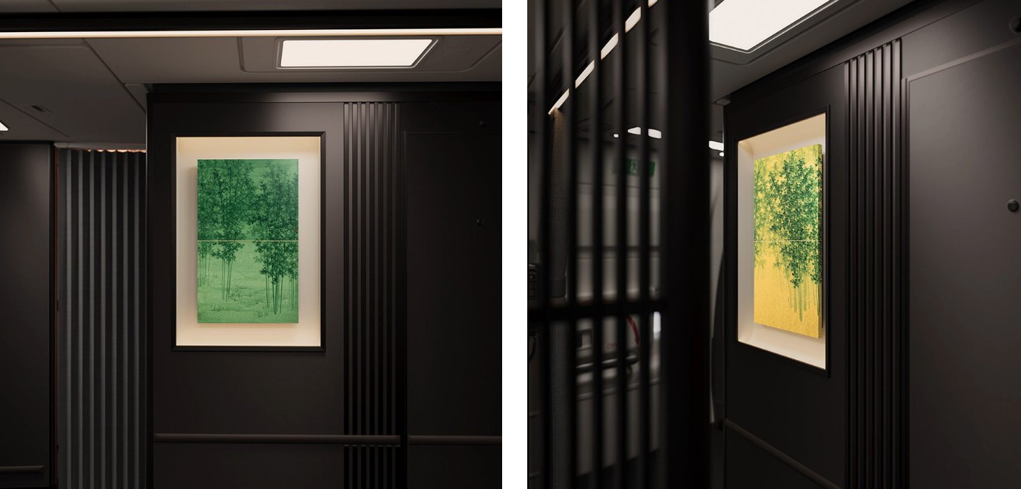 管偉邦作品《菉竹猗猗》和《會弁如星》。(圖片來源:國泰) 在此次升級中,特別推出了引人注目的“空中畫廊”,這一創新設施讓乘客在飛行中也能欣賞到藝術作品。從商務客艙進入時,乘客將立即被這個獨特的藝術展覽吸引,展出作品包括由香港藝術家管偉邦創作的《菉竹猗猗》和《會弁如星》。這些作品不僅展示了香港社會的多元文化,還巧妙地融合了金色和綠色的元素,打造出竹林的正午陽光氛圍,與國泰的品牌色相呼應。