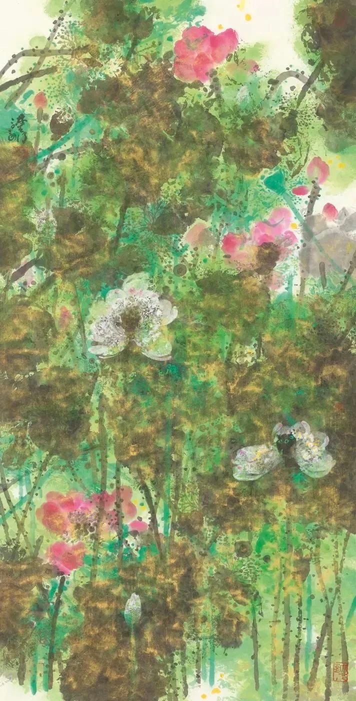 林天行《荷境》,水墨設色紙本,138x70cm,2018。 本次的展覽取名“百荷呈祥”,展出的100幅畫作均為近年新作,以荷入題、再由荷想及世間萬物與百樣人生,寓意吉祥,是畫家最美好浪漫的祝福。百幅荷花,各有姿彩,繽紛多元,意境暢達,既有蓬勃活力又不乏神秘高遠之感,餘韵裊裊不絕。畫荷,又不止於荷。