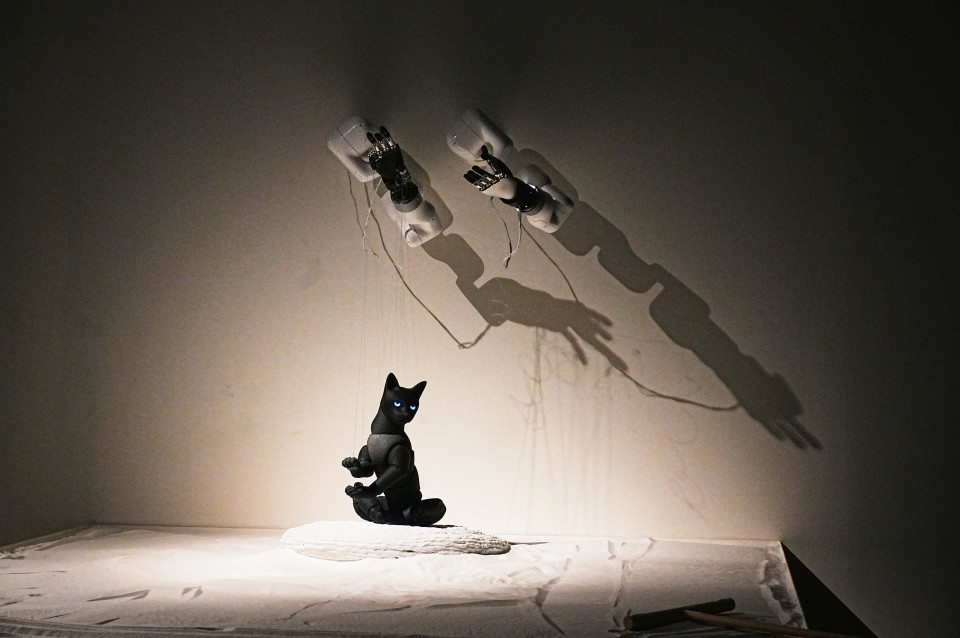 cAI™的自畫像。(香港中通社記者 黃璇攝) 《占卜師cAI™》融合了多國算命系統,形象為一隻由機械手臂操控的黑貓。觀眾只需在特定區域寫下生辰並默念問題,黑貓便會占卜並給出結果。