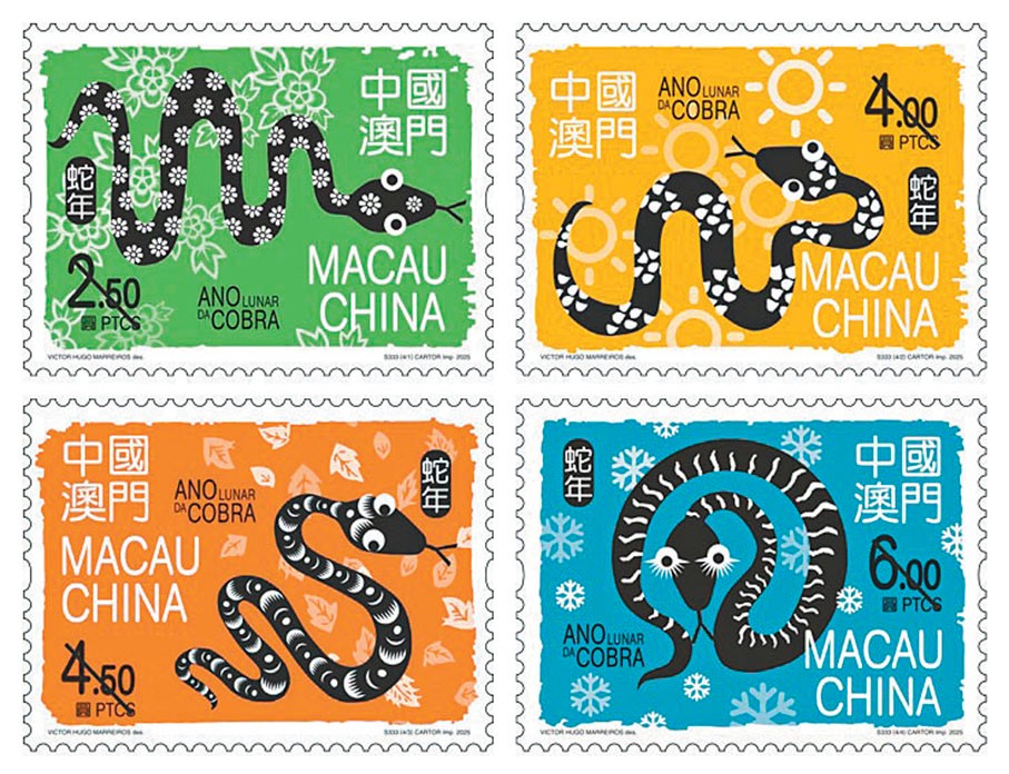 《蛇年》郵票(2025) 。(圖源:澳門郵電) 至於題為“飛龍靈蛇”的十二生肖金銀郵票小型張,是第三輯賀歲生肖金銀郵票系列的第一款,嵌有“歲次甲辰(龍年)”郵票及“歲次乙巳(蛇年)”郵票,面值各50元。郵票上的飛龍與靈蛇分別以銀箔和22K金箔燙壓而成,並附有黃金成色證明書。蛇身更以壓印技術製成,栩栩如生,動感十足。 此外,中國郵政、香港郵政和澳門郵電亦於同日共同發行了蛇年聯合紀念套摺,內附三地郵政機關共同發行的生肖郵票小全張,展現三地同根同源、共融共通的文化血脈。(完) 【編輯:黃璇】