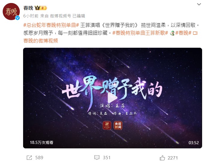香港新聞網1月22日電 中國知名歌手王菲將登上中國央視蛇年春晚舞台,這是她時隔七年再次參加春晚。 中國央視春晚星期三(1月22日)在官方微博發文稱:“王菲演唱《世界贈予我的》攬世間溫柔,以深情回敬。感恩歲月賜予,每一刻都值得細細珍藏。”