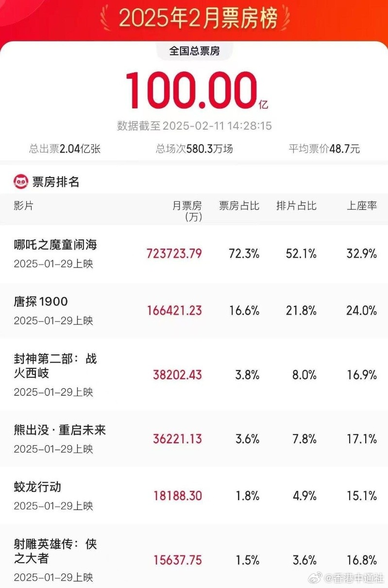 香港新聞網2月12日電 據貓眼專業版數據,截至2月11日14時28分,中國2月電影票房(含預售)破100億元人民幣,暫列單月大盤票房榜第7位。 其中,《哪吒之魔童鬧海》(《哪吒2》)以超72.3%的票房佔比登頂2月票房榜,《唐探1900》、《封神2》分別位列2月票房榜2、3名。