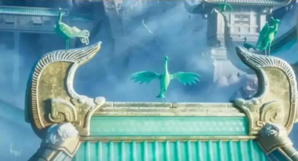 作為闡教的核心場景,《哪吒之魔童鬧海》中玉虛宮的設計堪稱中式美學的集大成者。純白如玉的琼樓玉宇以潑墨山水為基底,雕樑畫棟中融入“高處不勝寒”的哲學隱喻。哪吒前往玉虛宮時,有一群仙鶴飛舞,其中兩隻仙鶴落在玉虛宮屋頂的鴟吻上。這一幕靈感源自宋徽宗趙佶的傳世名作《瑞鶴圖》。