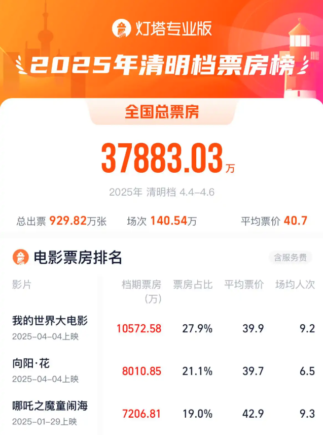 香港新聞網4月7日電 燈塔專業版數據顯示,2025年內地清明檔(4月4日-4月6日)以總票房3.78億元收官,觀影人次超928萬,場次141.3萬次。在影片票房排名方面,由全球知名游戲IP改編的動作奇幻片《我的世界大電影》以檔期票房破億的成績拔得頭籌。馮小剛執導、趙麗穎主演的劇情犯罪片《向陽・花》檔期票房超8000萬,位列第二 ,《哪吒2》則拿下檔期季軍。