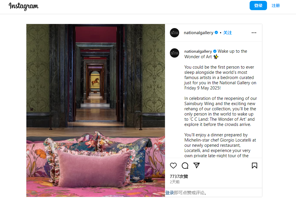 網友在INS上轉發的文章。INS上截圖。 報道指出,獲獎者可攜一位同伴,首先在國家美術館新開幕的Locatelli餐廳,享用由米其林星級主廚Giorgio Locatelli親手打造的精緻晚餐,為這場藝術之旅揭開序幕。晚餐後,美術館將清場閉館,獲獎者將在藏品與研究總監Christine Riding的專屬導覽下,搶先欣賞“C C Land: The Wonder of Art”特展,一睹從未公開展示的館藏珍品。 導覽結束後,獲獎者將入住特別布置的臥室。這間臥室位於連接新翼與主館的橋樑上,周圍環繞著文藝復興時期的經典名作。床鋪也別具巧思,由瑪莎(M&S)與英國國家美術館聯手設計,靈感源自館內藏品。次日清晨,獲獎者可在床上享用豐盛早餐,並在美術館正式開放前,獨享兩小時的私人遊覽時光。 能在名畫旁入睡的機會千載難逢,而這次活動完全免費。所有年滿18歲的人只需訂閱英國國家美術館的電子報,即可參與這場住宿體驗的抽獎活動。 英國國家美術館成立於1824年,坐落於倫敦市中心特拉法加廣場,是英國最重要的美術館之一。館內收藏超過2300件作品,涵蓋13至20世紀的西方繪畫精華,從文藝復興到印象派皆有傑作。其中,波提切利《維納斯與戰神》、梵高《向日葵》以及透納《戰艦無畏號》等,更是聞名遐邇的鎮館之寶。(完) 【編輯:關秀英】