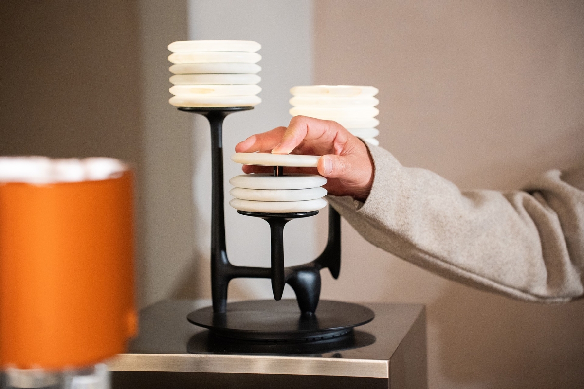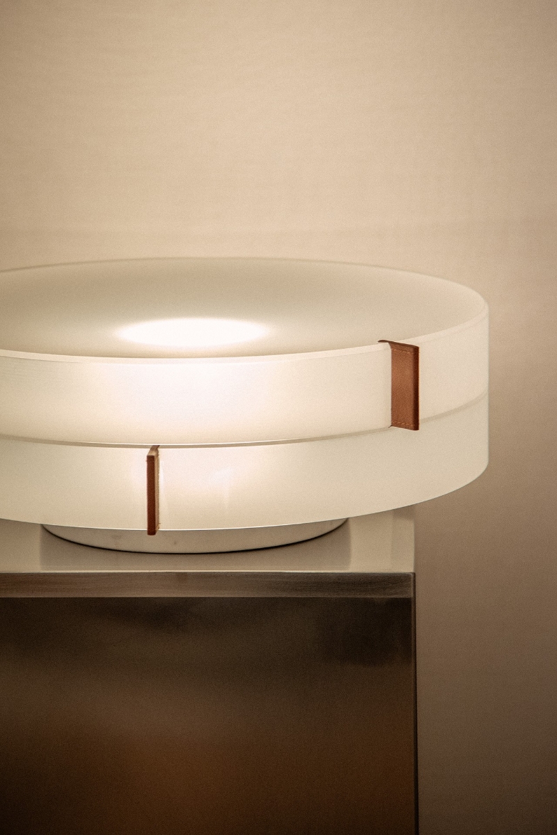 AUREA “皓”燈具以古典主義建築和雕塑廓形為靈感藍圖。 此次與Moorgen智能連袂呈獻的智能聚光充電檯燈系列,在米蘭設計周期間引起設計界矚目,見證兩大品牌創新基因的完美共振。系列代表作AUREA “皓”以古典主義建築和雕塑廓形為靈感藍圖,運用極簡主義風格重塑光影美學。皮質手柄輕旋間,層疊圓盤流轉出優雅的光影變奏,以當代設計語言築構現代奢華空間的光影敘事。