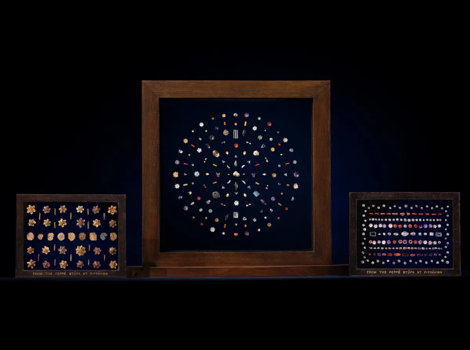 原定於今日上午10時30分拍賣的比普羅瓦釋迦牟尼佛寶聖物。這批寶物包括紫水晶、珍珠、珊瑚、石榴石、金飾等。(圖源:蘇富比) 根據1878年的《印度寶藏法案》(Indian Treasure Trove Act, 1878),發掘出的佛骨舍利及骨灰被印度政府贈予暹羅國王朱拉隆功,均分供奉於各佛教聖地;出土的石函、五個壇罐與大部分佛寶聖物,則由加爾各答的印度博物館典藏。發現人、莊園所有者佩沛則被允許保留剩餘重複、約為五分之一的佛寶花珠,即今次將被拍賣的這批文物。