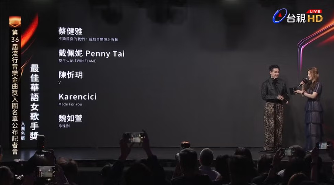 最佳華語女歌手獎入圍名單。(直播截圖) 蔡健雅《不夠善良的我們:戲劇音樂設計專輯》 戴佩妮《雙生火焰 TWIN FLAME》 Karencici《Made For You》 魏如萱《珍珠刑》 陳忻玥《V》 最佳華語專輯獎 入圍名單