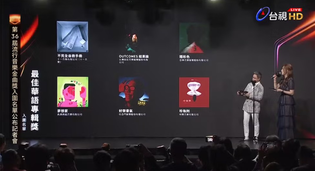 最佳華語專輯獎入圍名單。(直播截圖) 《不完全自救手冊》十一音像有限公司(十一音像) 《OUTCOMES結果論》台灣索尼音樂娛樂股份有限公司 《隱形色》亞神音樂娛樂股份有限公司 《夢想家》香港商賦有限公司 《好聲豪氣》任意門娛樂股份有限公司 《珍珠刑》何樂音樂股份有限公司 最佳年度歌曲獎 入圍名單
