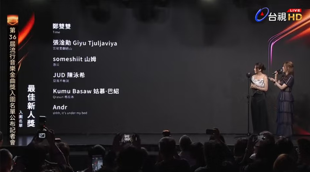 最佳新人獎入圍名單。(直播截圖) 鄭雙雙《TIME》 張淦勛Giyu Tjuljaviya《雲就要翻過山》 someshiit 山姆《愚公》 JUD陳泳希《當我不敢說》 Kumu Basaw 姑慕•巴紹《Qrasun 格拉孫》 Andr《shhh, it's under my bed》 最佳樂團獎 入圍名單