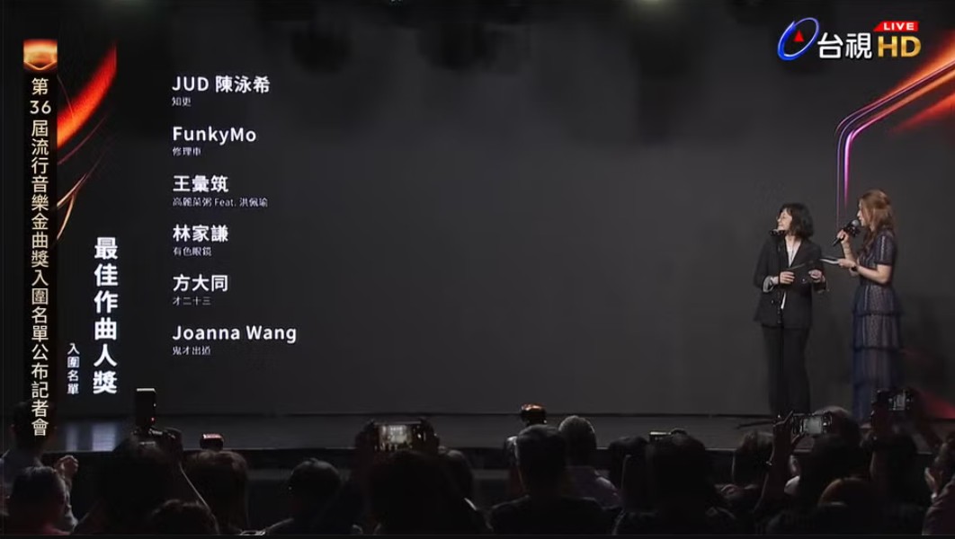 最佳作曲人獎入圍名單。(直播截圖) JUD陳泳希《知更》 FunkyMo《修理車》 王彙筑《高麗菜粥Feat.洪佩瑜》 方大同《才二十三》 Joanna Wang《鬼才出道》 最佳作詞人獎 入圍名單
