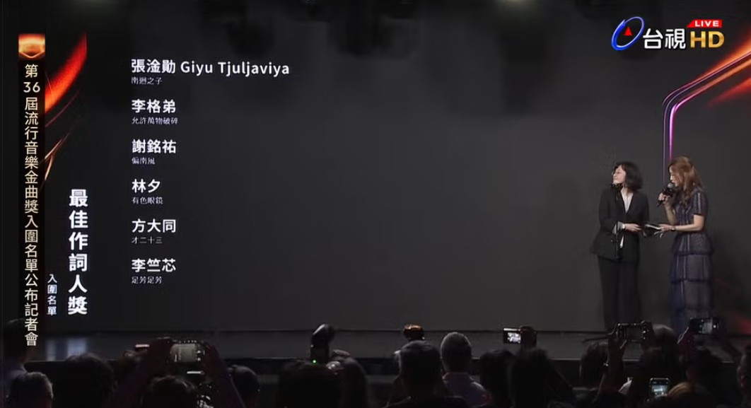 最佳作詞人獎入圍名單。(直播截圖) 張淦勛《南迴之子》 李格弟《允許萬物破碎》 謝銘祐《偏南風》 林夕《有色眼鏡》 方大同《才二十三》 李竺芯《足芳足芳》 特別貢獻獎 得獎名單