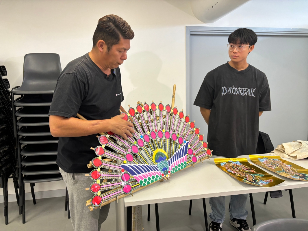 蔡榮基(左)指導學員花牌製作技巧。(香港中通社記者 黃璇攝) 學員們在花牌紮作課程中,跟隨“榮基花牌”第二代傳人蔡榮基學習。蔡榮基師承父親蔡創,擁有30年花牌製作經驗,並於2014年見證花牌紮作技藝列入香港非遺代表作名錄。他介紹,香港花牌獨具特色,採用“晾衫竹”為材料,通過精巧的綁紮與鮮艷貼片拼出吉祥圖案,如孔雀等,承載著深厚的文化寓意。