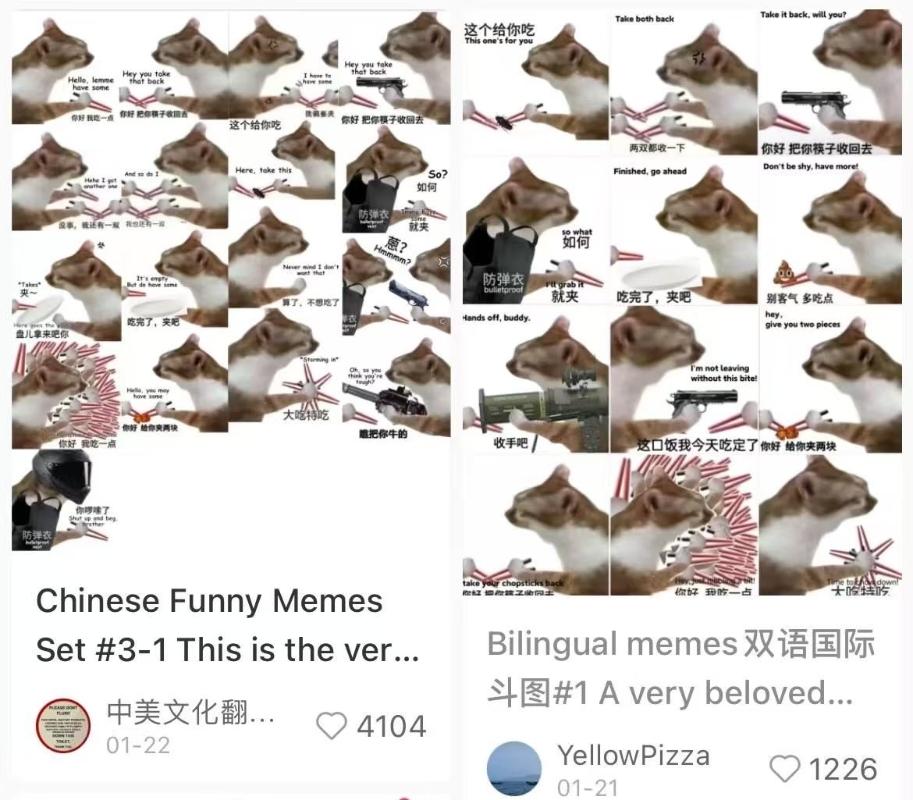 圖為“你好,我吃一點”表情包,圖源自網絡。 近來,台灣網絡上流行一個貓咪拿著筷子的表情包,搭配“你好,我吃一點”的文字。台灣網絡熱門話題分析網站“網絡溫度計”28日發文稱,這波“我吃一點”貓咪表情包旋風,起因於許多在台旅遊的日韓遊客會在社交平台上分享美食和美景,這些帖文吸引了台灣網友的注意,便用一張張“你好,我吃一點”的貓咪表情包“洗版”留言區。 許多日韓網友一開始都滿頭問號,但很快就意會過來,紛紛回應“歡迎你來”“吃光了sorry”。台灣網友則立刻補上“沒事,我還有一雙(筷子)”的表情包,讓這種逗趣的互動迅速蔓延開來。有意思的是,一位韓國網友竟“提前預判”進行了“神級反擊”,直接放上一張用中文寫著“你好,把你筷子收回去”的貓咪反擊表情包,讓台灣網友瞬間“崩潰”又爆笑,帖文更是超過百萬瀏覽。 就連台北故宮博物院的小編也跟上這波潮流,在社交平台上分享精緻的魚蝦蟹書畫作品時,配文“您好 我吃一點”,趁機宣傳了近期正舉辦的“呷飽未—故宮書畫裡的飲食”特展。 其實,“你好,我吃一點”的貓咪表情包去年11月就已經在小紅書、抖音等大陸社交平台流行,甚至還“順著網線”火到外國。今年1月,許多美國TikTok用戶自稱為“TikTok難民”湧入小紅書,與中國網友進行了許多有趣的互動。除了“交貓稅”(發布自家貓的照片來打招呼),英語、數學“作業幫”,中餐教學,對賬(比較兩國消費水平)等,搞笑的表情包也深受外國網友們的喜愛。有外國網友還發帖“求圖”,而貼心的中國網友則將表情包中標注上英文,以便外國網友理解,“你好,我吃一點”的貓咪表情包也因此被許多外國網友“收入囊中”。