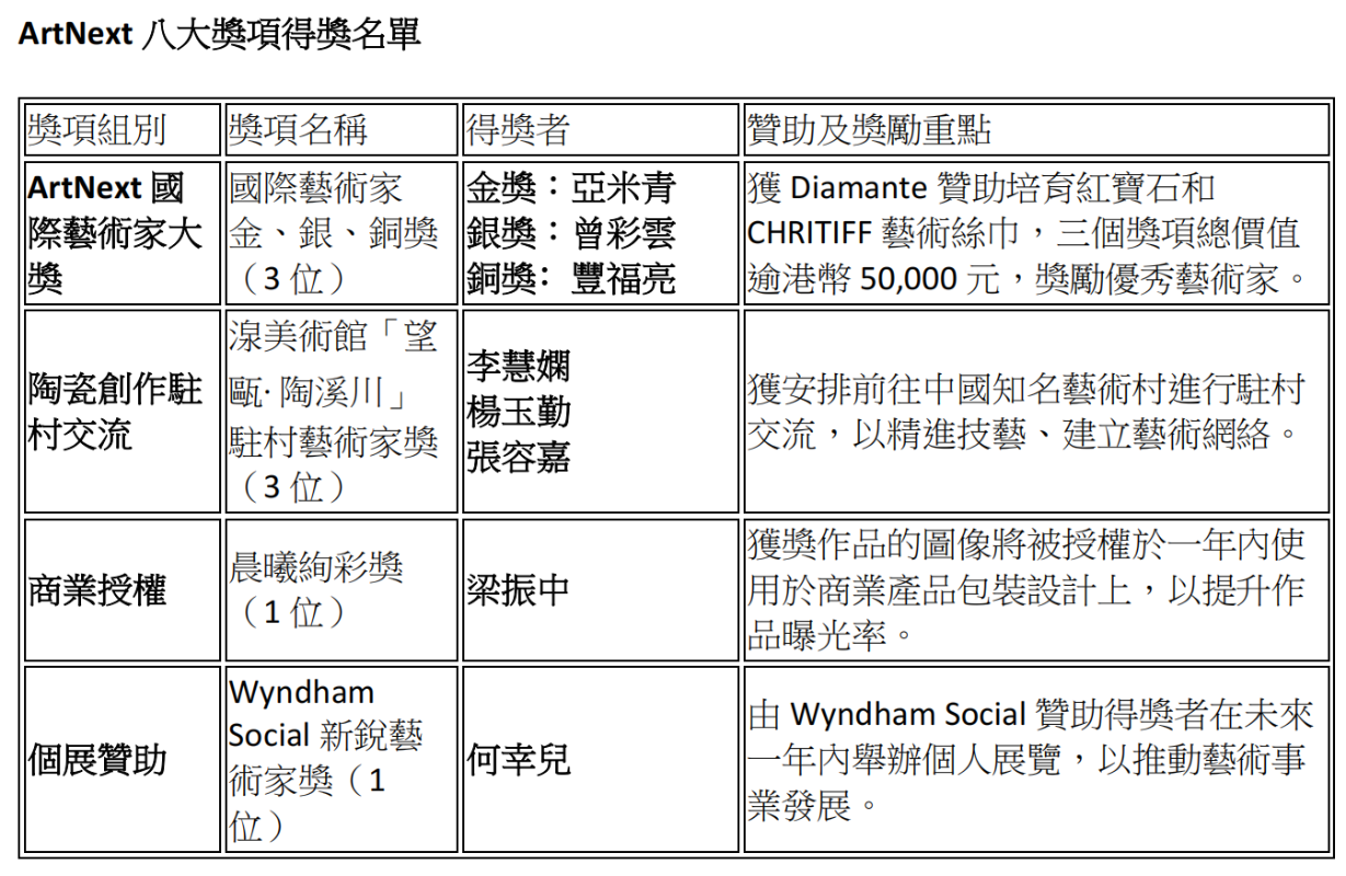 得獎名單 ArtNext Fair 2025 新藝潮的開幕典禮主禮嘉賓包括文化體育及旅遊局局長羅淑佩、立法會議員李浩然、香港藝術發展局副主席楊偉誠、香港故宮文化博物館館長吳志華、香港恒生大學藝術及設計系系主任許焯權,以及 ArtNext Fair 新藝潮創辦人黃白露。 本屆 ArtNext 國際藝術家大獎由業界頂尖專家組成的評審團隊進行遴選,確保過程的嚴謹與公正性。評審團隊成員包括香港浸會大學視覺藝術院客席教授鄧海超、著名藝術家陳育強、獨立學者及藝評家 Isabelle Jennifer Frank、著名藝術家鍾大富,以及本屆策展人周婉美。 評審團表示, ArtNext 國際藝術家大獎旨在嘉許在藝術創作上展現出獨特視野、卓越技巧及深厚潛力的藝術家。 其中,ArtNext 國際藝術家大獎評審鄧海超教授表示,整體而言,今屆的新藝潮國際藝術家大獎得獎者,以其獨特的藝術語言和對當代社會的敏銳觀察獲得評審團高度肯定。其中,金獎得主亞米青展區作品展示了紮實的繪畫基礎和別樹一幟的個人風格脫穎而出。銀獎得主曾彩雲的作品展現藝術家以曼陀羅、蝴蝶題材表達人生、宗教和治愈關係的意念並結合水墨技巧,具有發展潛力。銅獎得主日本藝術家豐福亮觀察敏銳,善於捕捉社會具象徵性的物件和城市特質,切合一個時代的社會面貌和精神。他們的藝術探索,反映當代精神和香港文化內涵,體現 ArtNext Fair 新藝潮的使命及願景。(完) 【編輯:梁嘉軒】