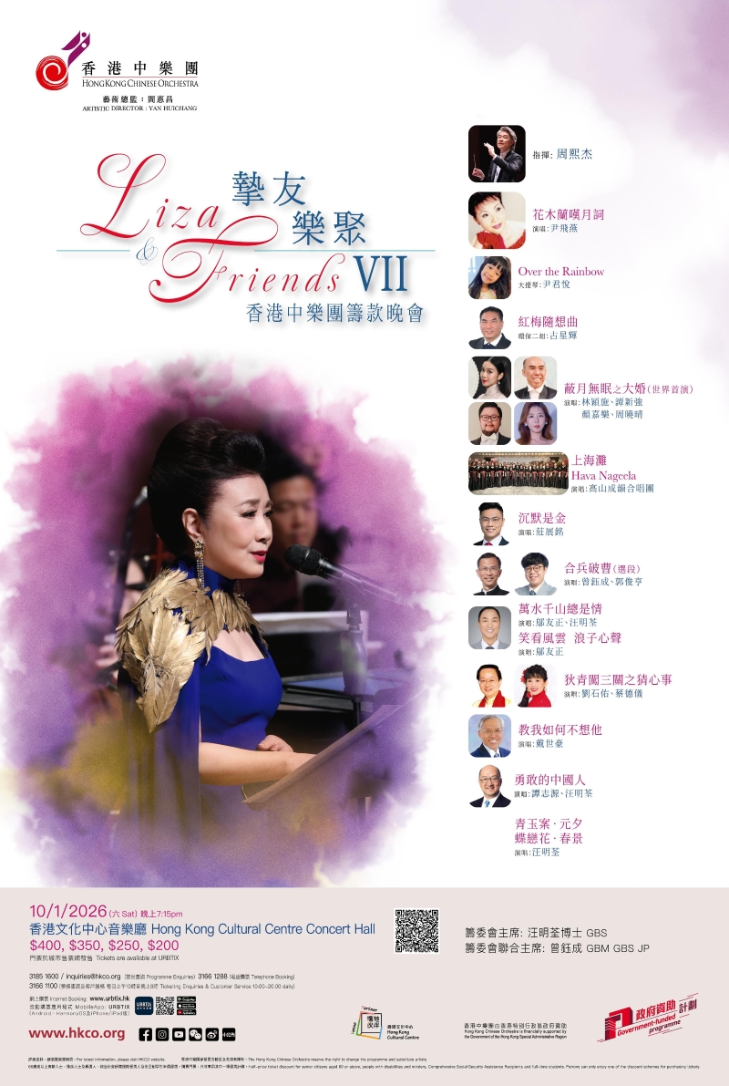香港中樂團年度籌款晚會《Liza & Friends摯友樂聚》海報。 香港中樂團助理藝術總監兼常任指揮周熙杰將擔任音樂會的指揮。演出陣容星光熠熠,演出嘉賓除了汪明荃及曾鈺成外,尹飛燕、尹君悅、古星輝、林穎施、譚新強、顏嘉樂、周曉晴、高山成韻合唱團、莊展銘、郭俊亨、鄔友正、劉石佑、蔡德儀、戴世豪、譚志源將聯同香港中樂團一同獻藝。 Liza姐將於音樂會上獻唱多首經典金曲,當中包括與鄔友正合唱的《萬水千山總是情》,以及與譚志源獻唱的《勇敢的中國人》。此外,香港中樂團早前更特別誠邀香港作曲家伍卓賢為Liza姐度身訂造的三首結合宋詞及中樂的經典之作並拍攝MV。今次,特別揀選辛棄疾《青玉案.元夕》及蘇軾《蝶戀花.春景》於音樂會上與樂團演出。 粵曲環節同樣精彩,曾鈺成將聯同粵劇演員郭俊亨,演出粵曲選段《合兵破曹》,二人將通過唱段,展現《三國演義》中的精彩情節,為節目增添戲曲韻味。此外,粵劇名伶尹飛燕將演唱經典粵曲《花木蘭嘆月詞》,該曲更是尹飛燕初晉正印花旦時的代表作,曾於新光劇院上演,見證了她藝術生涯的重要轉折,別具意義。 劉石佑及蔡德儀將攜手重現北宋名將狄青與雙陽公主的動人愛情故事《狄青闖三關之猜心事》;林穎施、譚新強、顏嘉樂、周曉晴則呈獻中西合璧歌劇《蔽月無眠》之〈大婚〉,演出融合意大利歌劇及粵劇之美,同時展現兩種藝術形式的魅力。(完) 【編輯:黃璇】