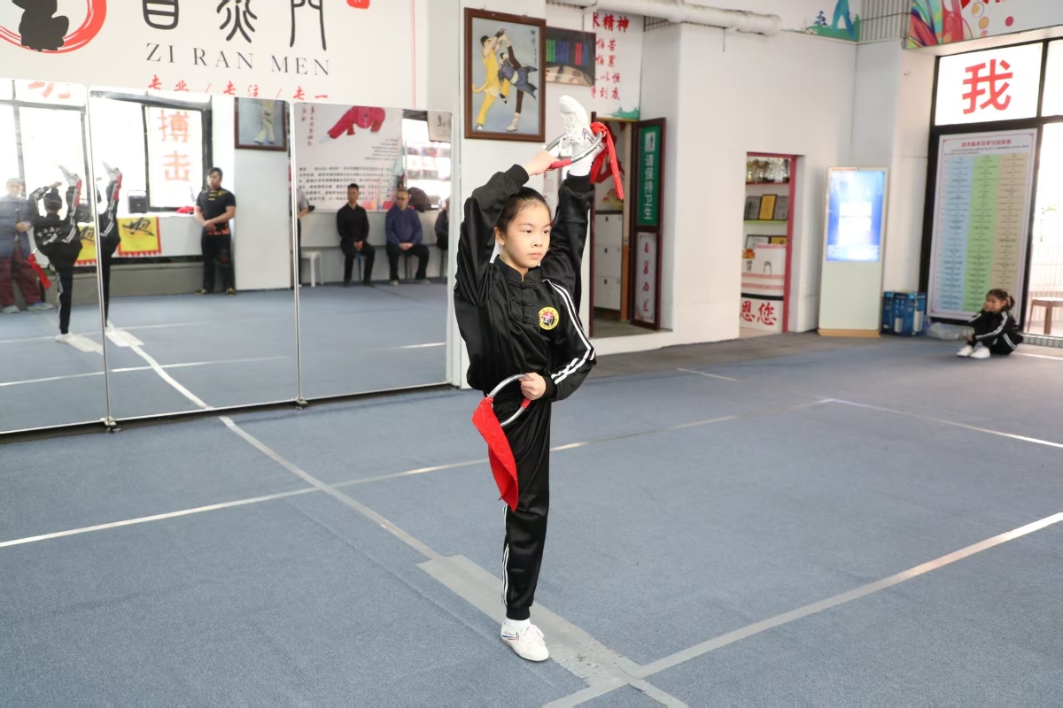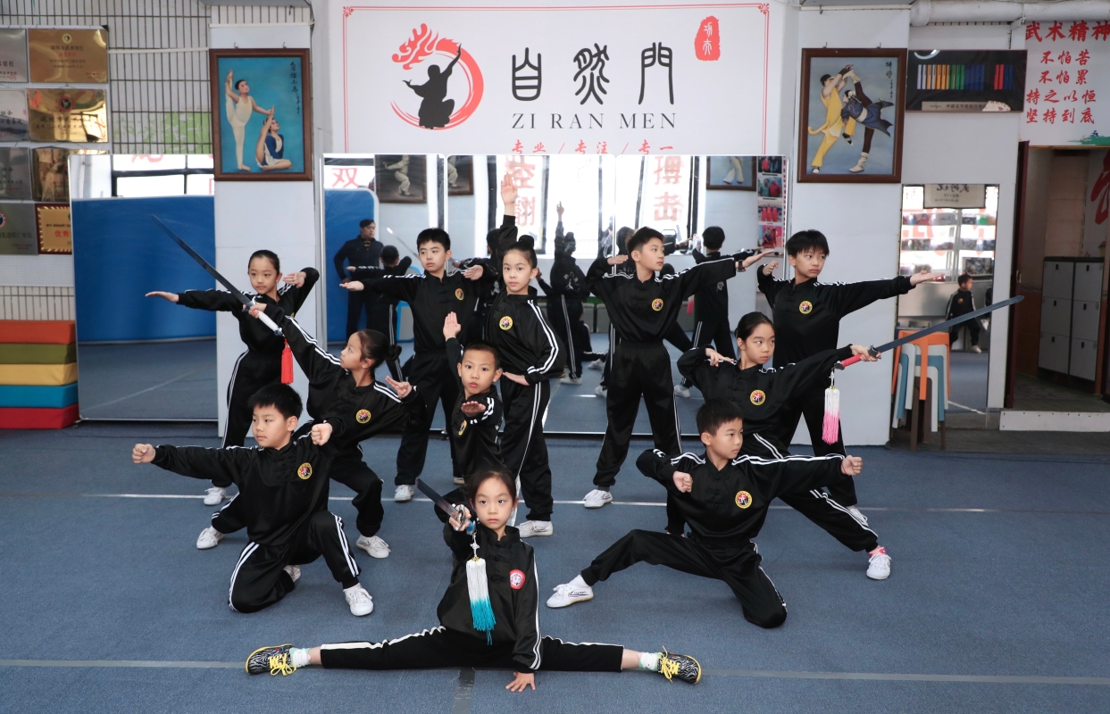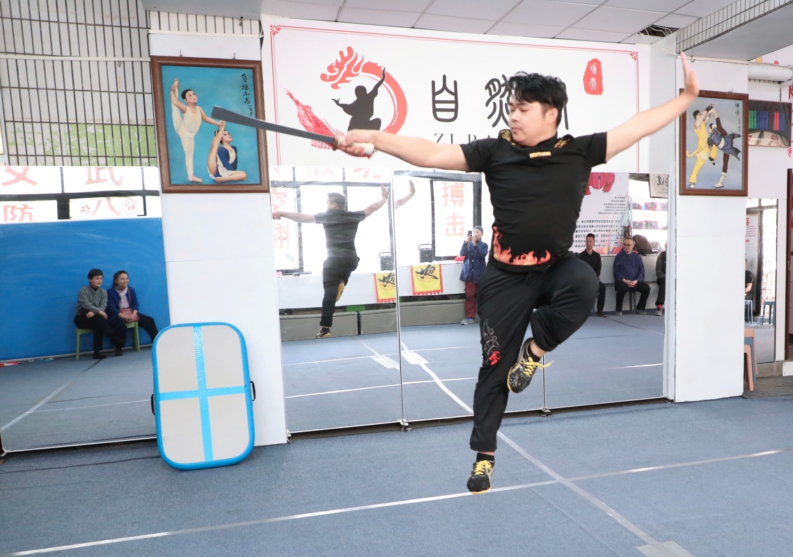 自然門龍女武術館學員們展示了紮實的基本功。 武藝切磋 傳統與現代的碰撞 交流會上,雙方各顯身手,精彩紛呈:深圳市自然門龍女武術館學員們展示了紮實的基本功;駐館教練庹樂意演練刀法,龍乃菁館長則親身示範長穗劍。