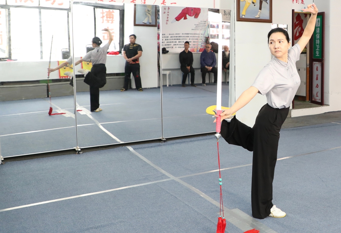 國家一級教練員/中國武術五段/駐館教練庹樂意演練刀法。