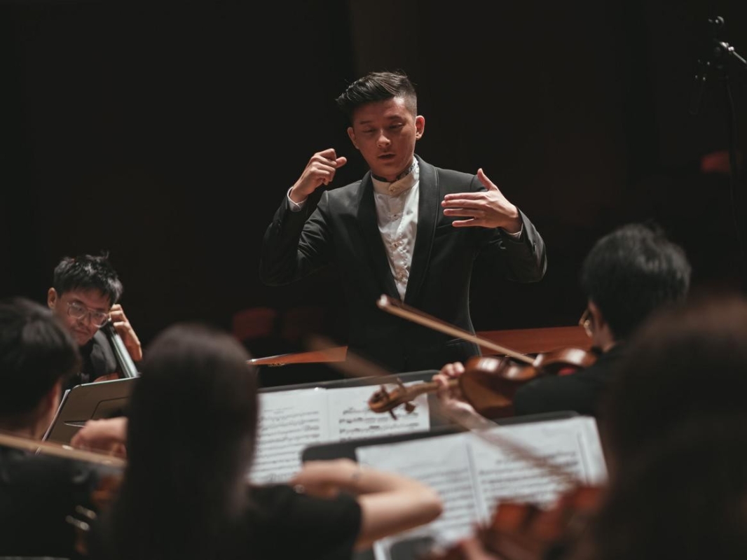 終於迎來香港青年音樂家黃家正鼎奏五貝《貝多芬全集》音樂會,原來他不但指揮鼎奏樂團,最後更自己指揮兼鋼琴彈奏第五鋼琴協奏曲“帝皇”。 指揮兼演奏,黃家正像一個音符在舞台上跳來跳去,他沒有像傳統的指揮站在指揮台上,而是更走進樂隊,巨大的三角鋼琴在他身後,他穿緊身黑色西裝,真的很像符杆,雙手揮動時就像五線譜音符的符頭,不管是什麼譜號,音符游弋期間向上走向下走。他時而面相小提琴,時而面向大提琴,時而指向吹奏樂部,他渾身散發的激情,向觀眾展現了貝多芬的音樂畫卷,激昂輝煌及浩瀚星空。