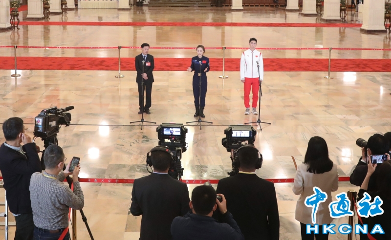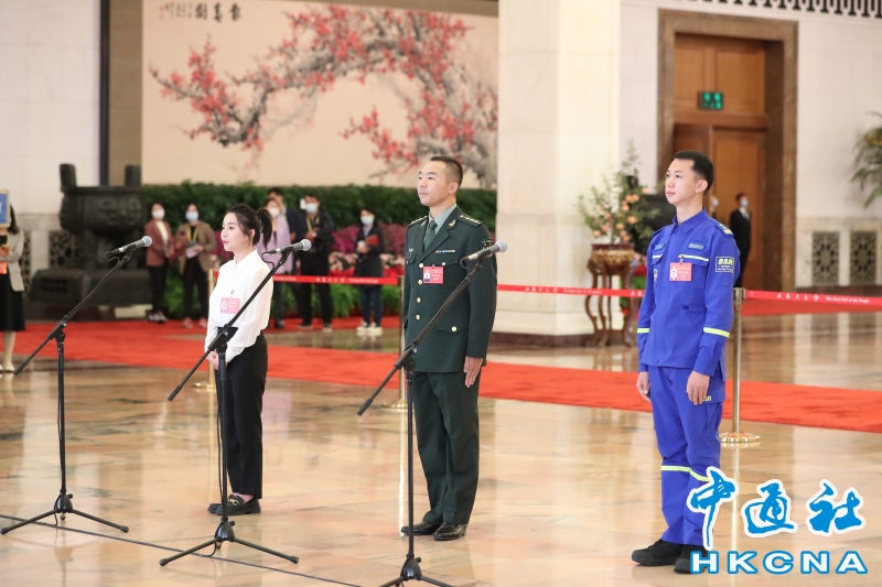 •   10月16日,中國共產黨第二十次全國代表大會在北京人民大會堂開幕。大會開幕前,舉行“黨代表通道”採訪活動。圖為姜麗娟、孫金龍、於若飛代表(自左至右)接受採訪。 香港中通社圖片
