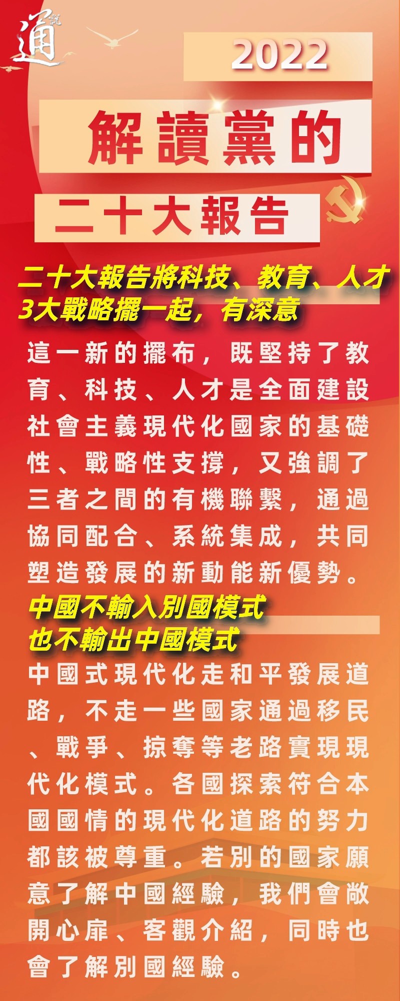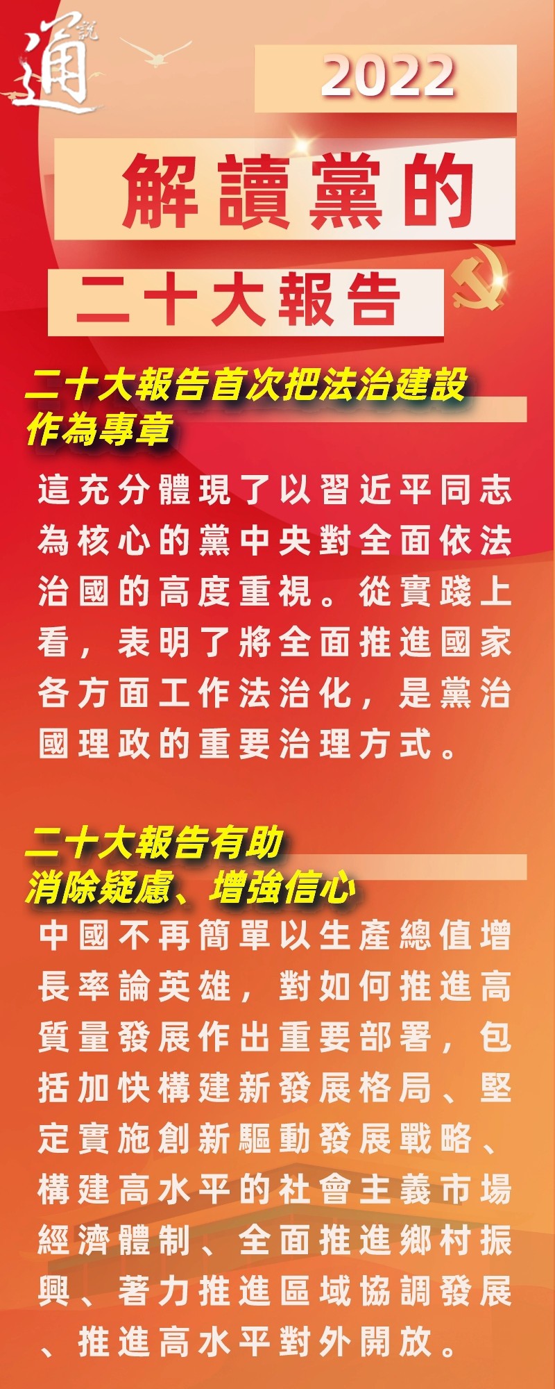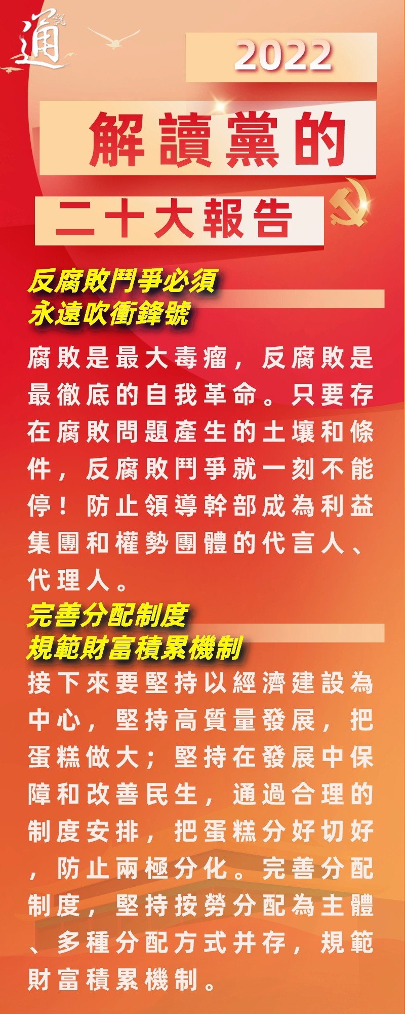 香港新聞網10月24日電 24日,中共中央舉行新聞發布會,介紹解讀黨的二十大報告。中紀委稱,反腐敗鬥爭必須永遠吹衝鋒號,防止領導幹部成為利益集團和權勢團體代言人;中宣部強調,中國不輸入別國模式也不輸出中國模式......如何解讀二十大報告,戳圖了解!